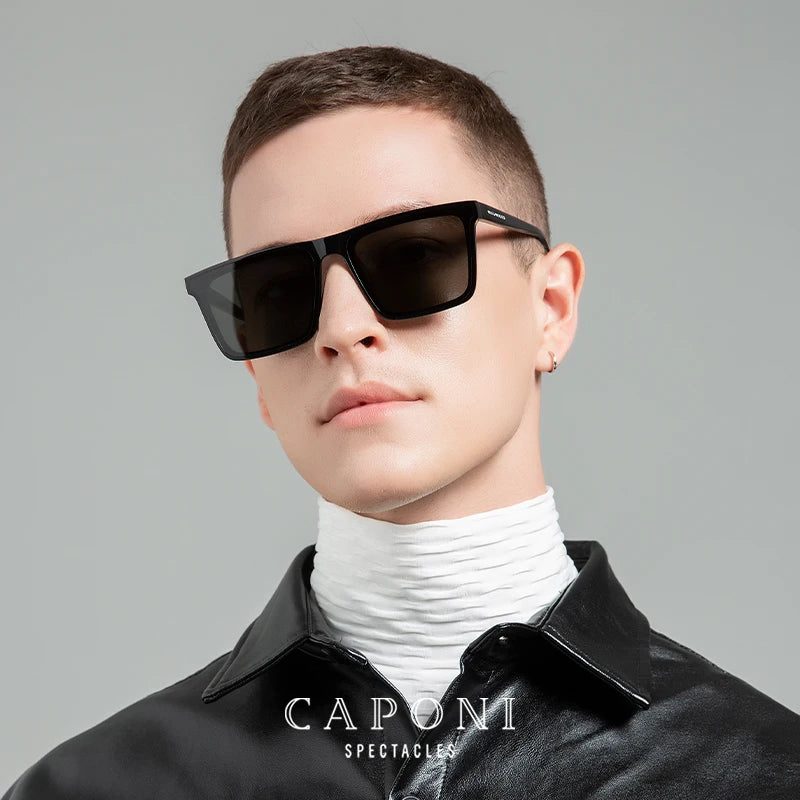 CAPONI Nylon Polarized Sunglasses High Quality Acetate Square Flat Design Sun Glasses For Men UV400 Protect Black Shades CP7499