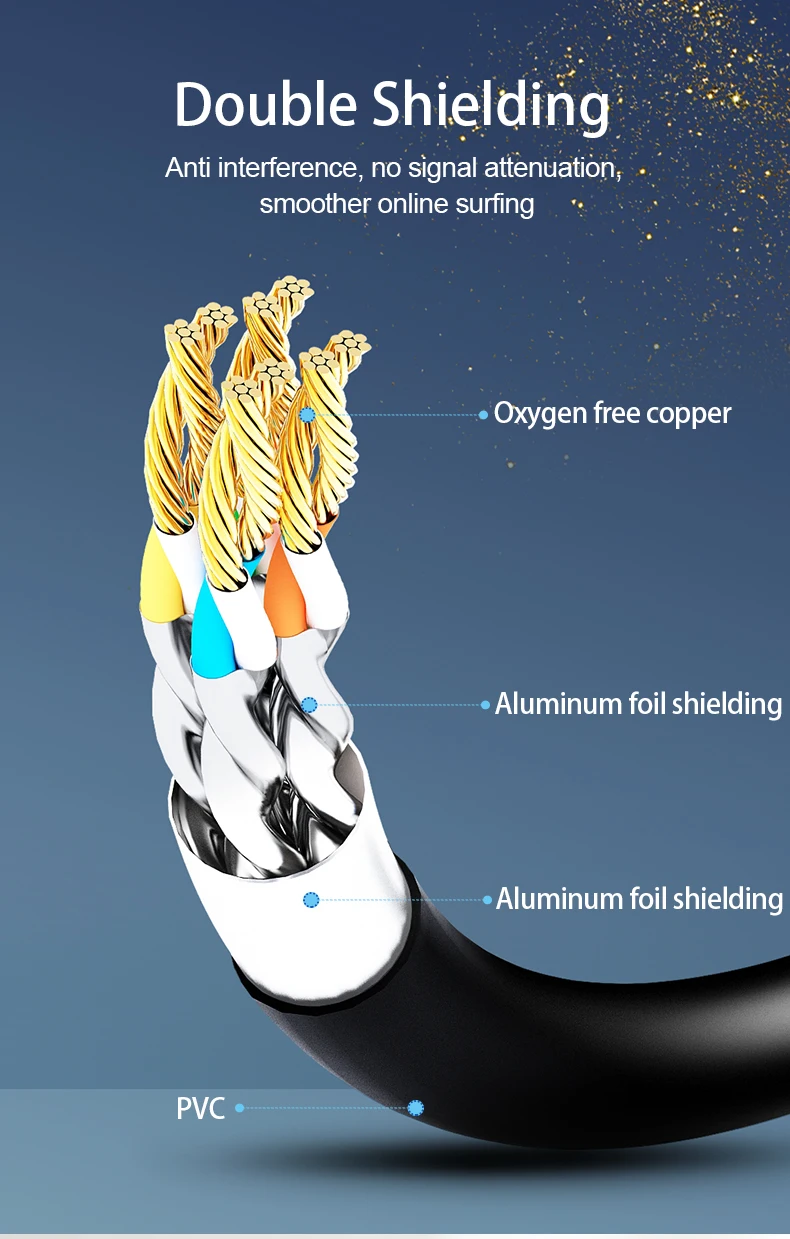 Cables are designed with 4 shielded foiled twisted pairs (F/FTP) and an aluminum foil shielding layer. This design can greatly reduce interference and crosstalk from adjacent pairs and other cables, making network speed faster and more stable.