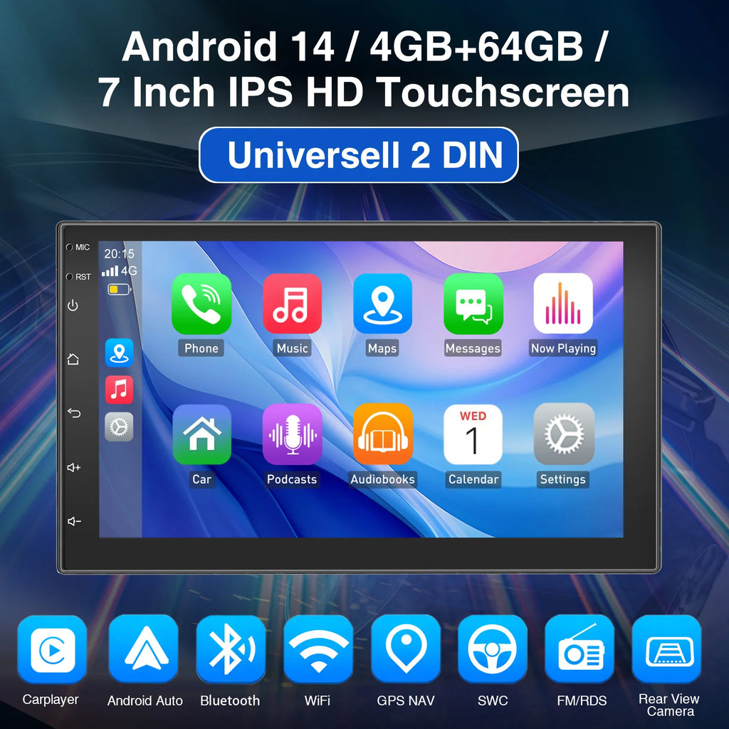 7 Inch 2 DIN Android Car Radio: The Android car radio with 7 inch IPS capacitive touch screen, 4GB RAM and 64GB ROM provides enough space to download your favourite apps and videos, so driving won't be boring anymore. With two USB ports, it supports fast mobile phone charging. With the rear microphone input, you can add a microphone to make your voice clearer (MIC is optional).