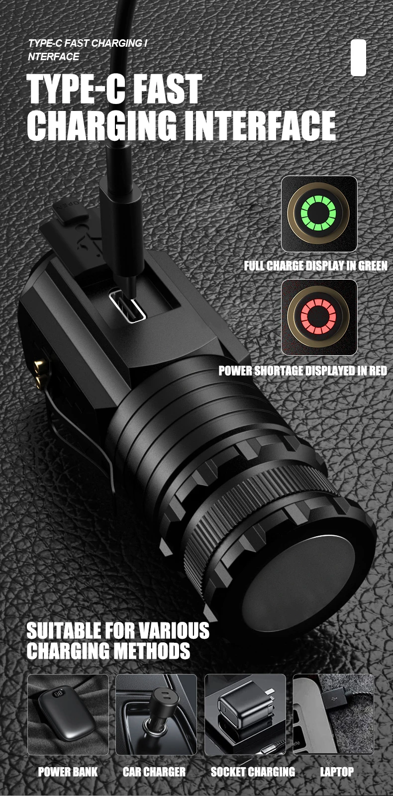 Charging port specification: Type-C Fast charging (Display green when fully charged, Low power display in red)