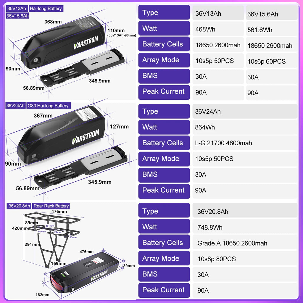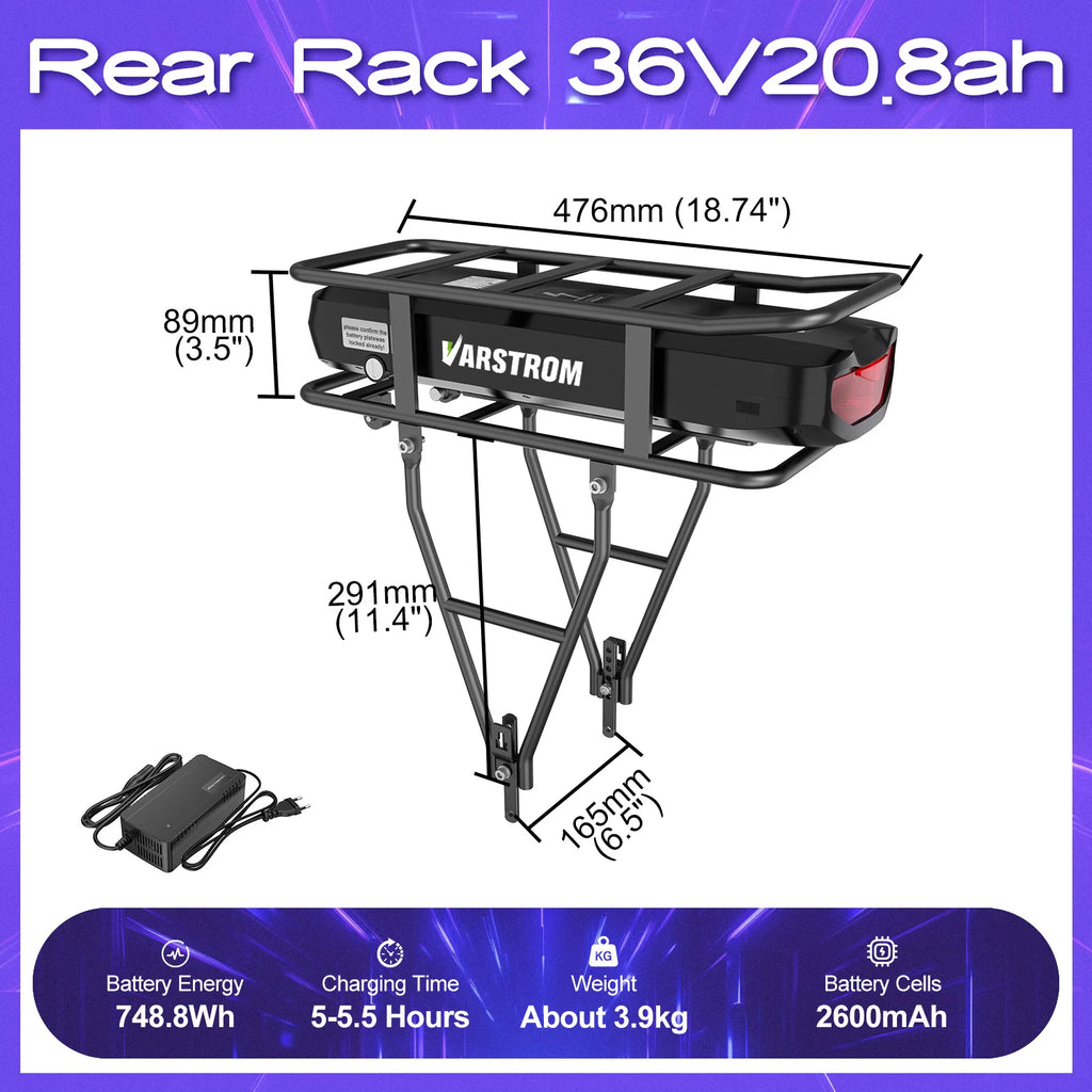 36V22.5Ah Rear Rack Battery: Grade A 18650 2600mah 10S8P 80PCS (4A Charger)