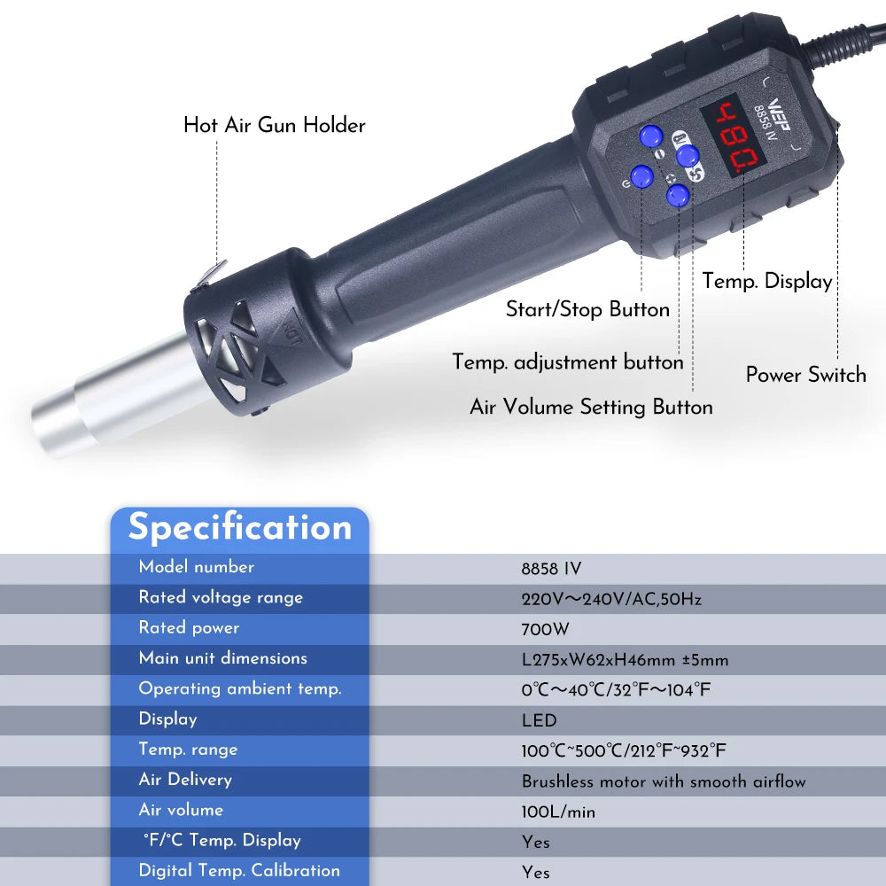 means that 8858-IV is noiseless, constant, long lifespan hot air gun.