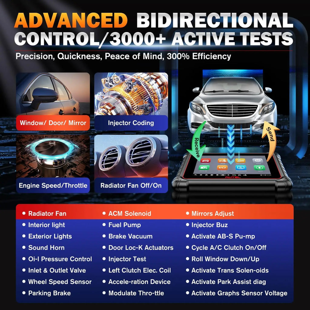 Inherited from MP808BT MS906 & 3000+ active tests, Autel MK900-BT escaner automotriz professional is mo.re powerful tha.n oth.ers with only 50+ tests. Directly send command to ECUs & monitor actuat.ors operation to quickly pinpoint issues, it takes your diagnostics to the n.ext level with menu lists 3000+ active tests. Such as fuel inje.ctor, coo.lant fans, coola.nt pump, win.dshield wipers, E.G-R valve, sunroof, windows/ door/ skylight etc.