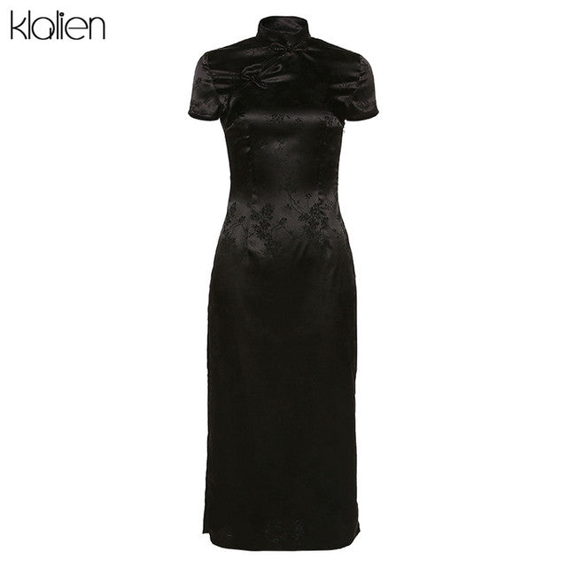 KLALIEN Negro Monocromo Impresión Satén Vestidos Chinos Tradicionales Vestido Largo Qipao Sexy Split Tang Traje Banquete Qipao Mujer