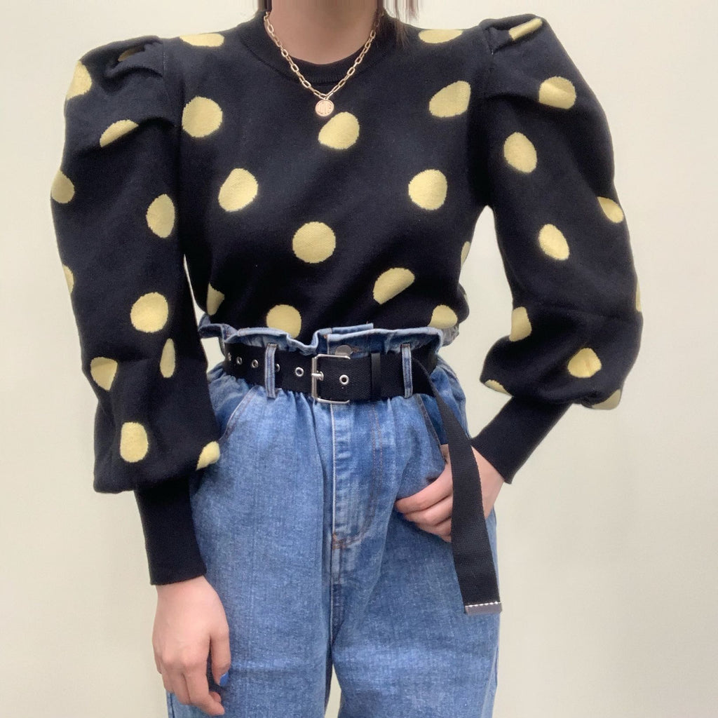 Jersey coreano de manga abullonada para mujer, prendas de punto, Top de invierno de lunares para primavera y otoño 2020, jersey de punto con cuello redondo, Jersey inferior