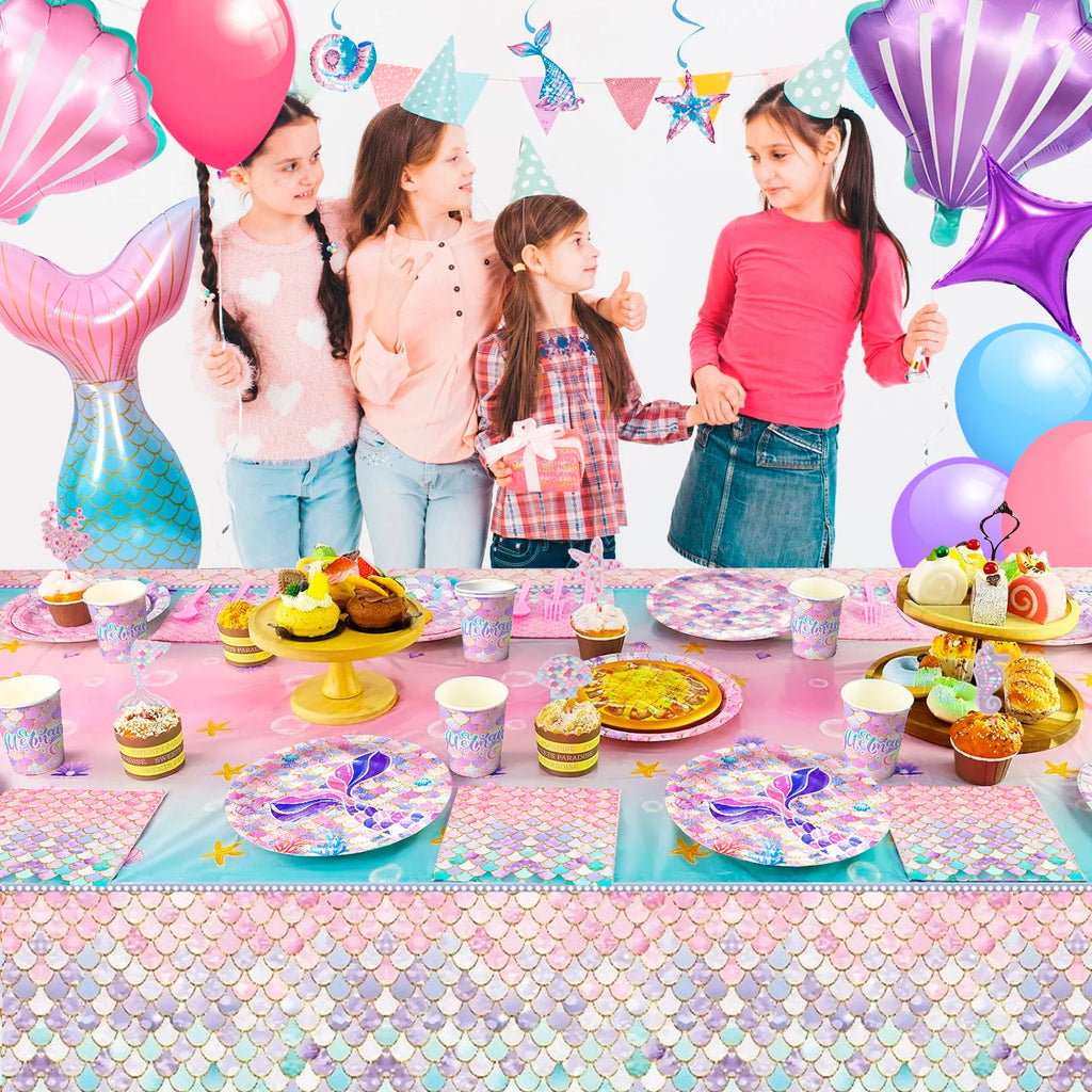 The mermaid birthday supplies kits contains everything you need to host a mermaid theme party, so you don't have to spend a lot of time picking out mermaid party decoration and mermaid plates and cups and napkins supplies one by one.