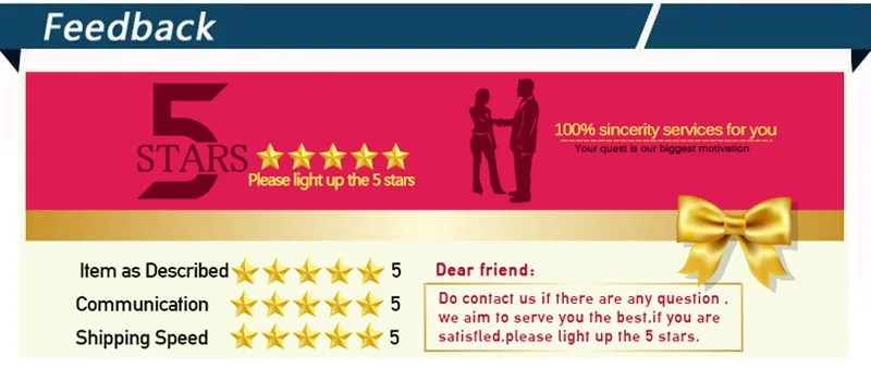Customer satisfaction and encouragement is very import to us. If you are satisfied with the items you ordered, please leave 5 star feedback. If you are not satisfied with the items you ordered, Please contact us before leaving negative feedback. We can work together to solve any issue.Thank you.