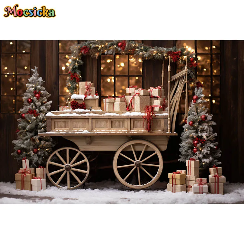 Christmas Gift Cart Photography Backdrop Baby Kids Family Portrait Photocall Xmas Tree Snow Window Background Props Photo Studio