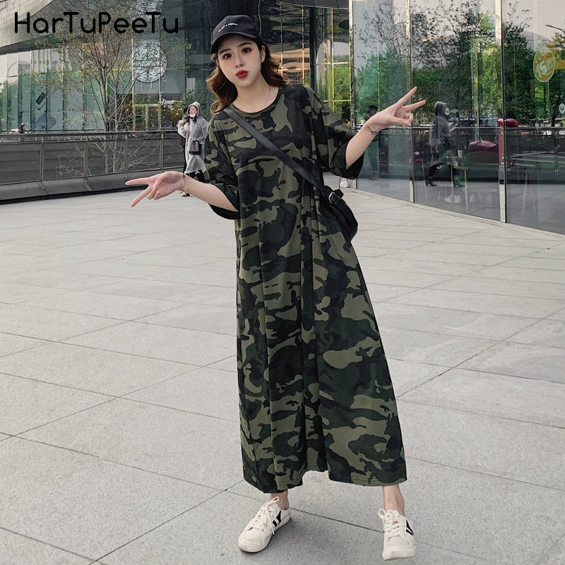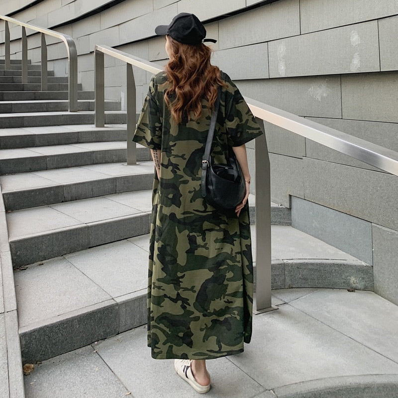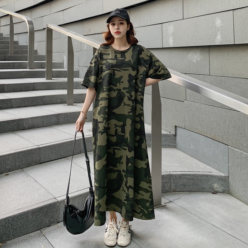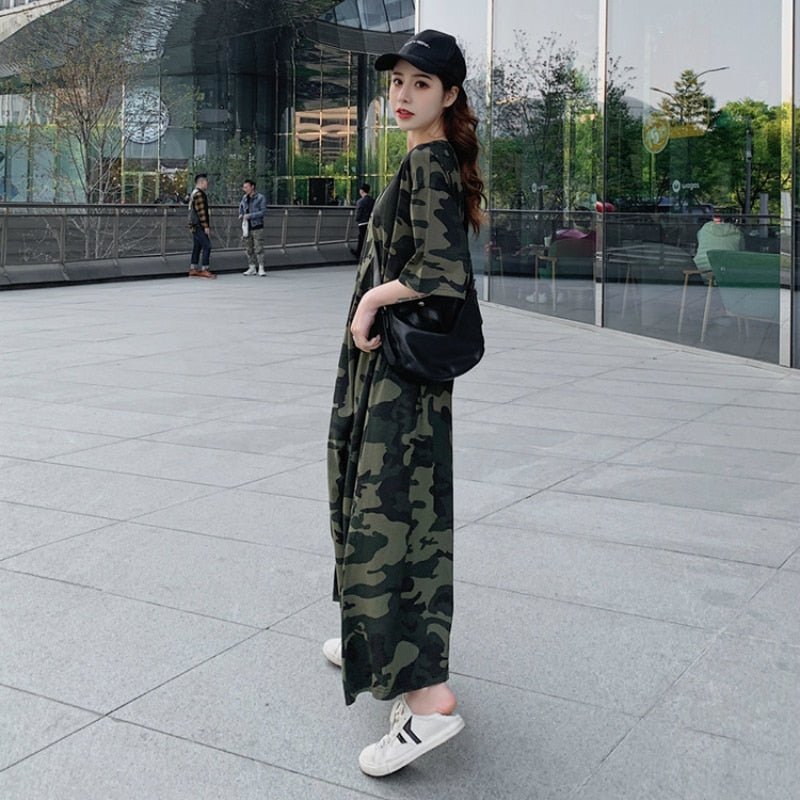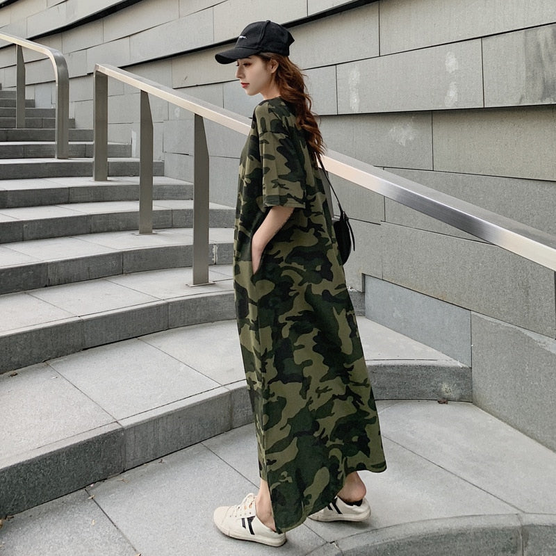 Lose Casual T-Shirt Maxikleid Frauen Sommer 2022 Vestido Mujer Camouflage Kleider mit Seitentaschen für Zuhause Lange Baumwoll-T-Shirts