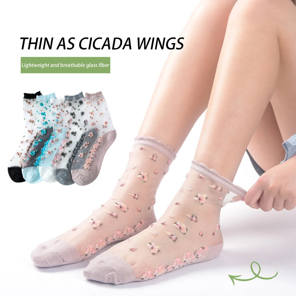 5 Pair Summer Thin Socks for Women Middle Tube Flower silk stockings Transparent Breathable Floral Sock Soft Spring Girl Socks