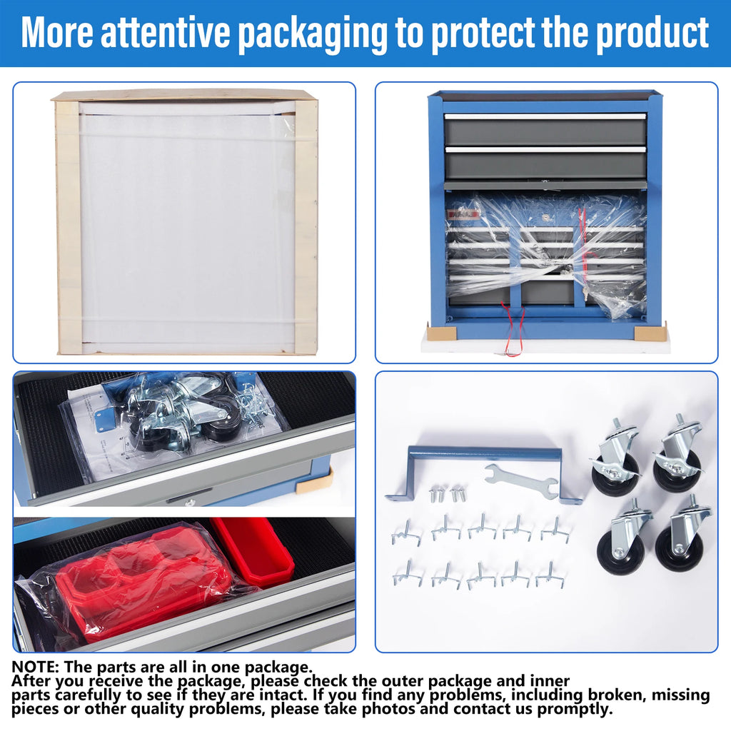 • Tool Chest with wheels - 4 X 1 inch rubber universal wheels to reduce noise when pushing, and the rear wheels are equipped with brake locking devices to make it more stable and safer when parked.