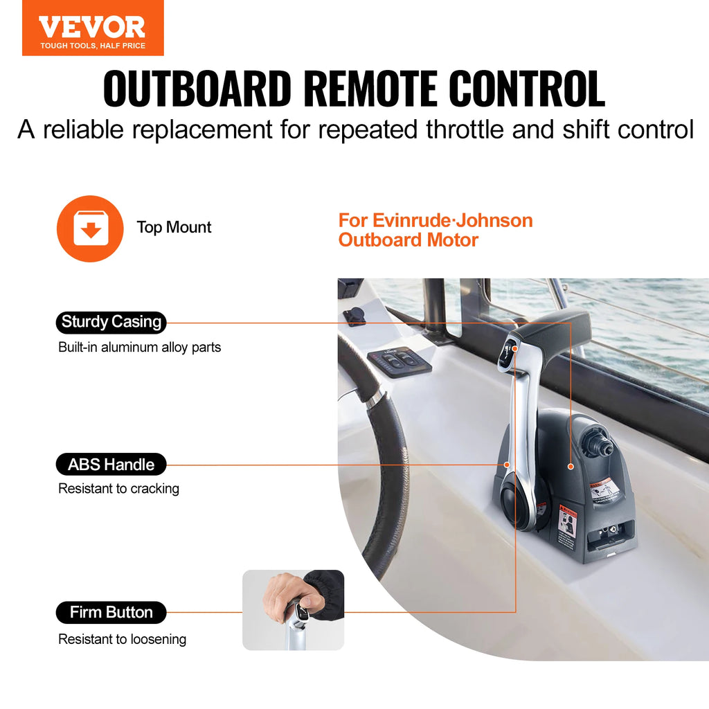 • Durable and Reliable Build: Crafted from aluminum ADC2+ASA and featuring an ABS shell handle, this top-mounted outboard remote control kit is designed for durability. The robust materials and plastic button ensure firm, reliable operation, even during frequent push-pull maneuvers. Long Control Cable for Flexibility: Equipped with two cable harness options – a 2.1 ft/640 mm 6-pin connector and a 2.4 ft/740 mm 3-pin connector – this control box provides ample reach for installation. Always remember to turn off the ignition, remove the key, and disconnect cables before measuring cable lengths. Emergency Stop Lanyard for Safety: This throttle control box features a built-in emergency stop switch with a lanyard. It automatically halts the engine if the driver is displaced, enhancing safety. The lanyard can be attached securely to the driver's wrist or waistband. Smooth Gear Shifting Control: For precise gear shifting, press the neutral release button to engage gear, then push the control lever forward for forward gear and backward for reverse, both by approximately 35°. The friction adjustment knob allows fine-tuned control of speed and thrust. Trim and Tilt Adjustment for Flexibility: The power trim and tilt switch on the control lever handle lets you easily adjust the position of the stern engine. Use the ""↑"" button to tilt upward and ""↓"" to tilt downward, optimizing engine performance during loading/unloading and minimizing engine submersion.