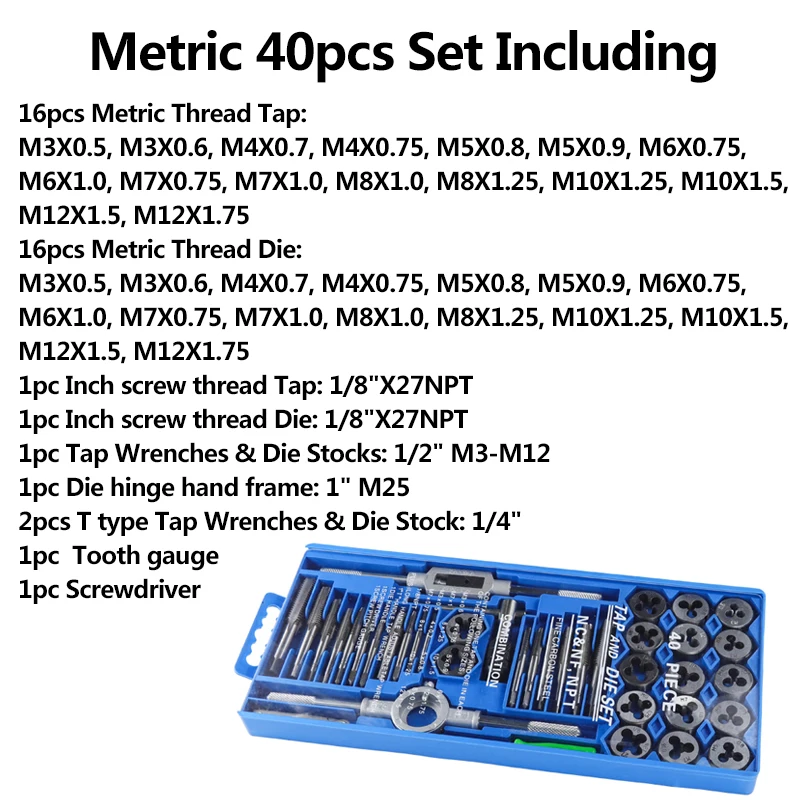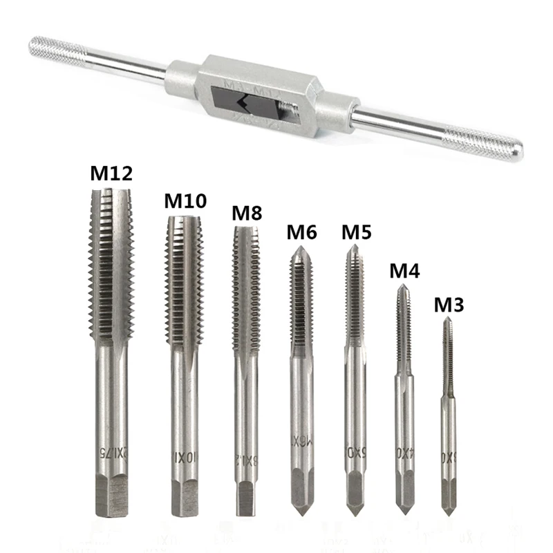 Tap sizes: M3x0.5mm,M4x0.7mm,M5x0.8mm,M6x1.0mm,M7x1.0mm,M8x1.25mm,M9x1.25mm,M10x1.5mm,M12x1.75mm(Each one pcs)