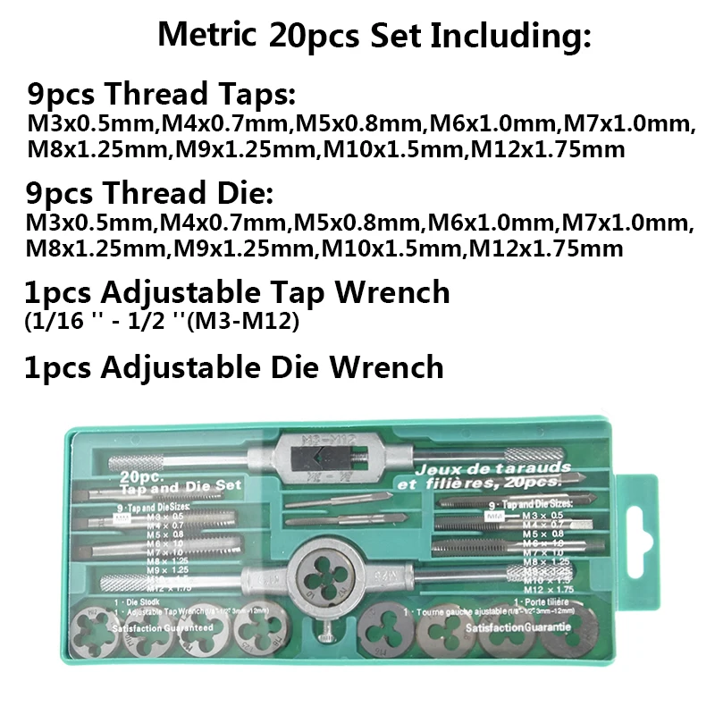Die sizes: M3x0.5mm,M4x0.7mm,M5x0.8mm,M6x1.0mm,M7x1.0mm,M8x1.25mm,M9x1.25mm,M10x1.5m,M12x1.75mm(Each one pcs)