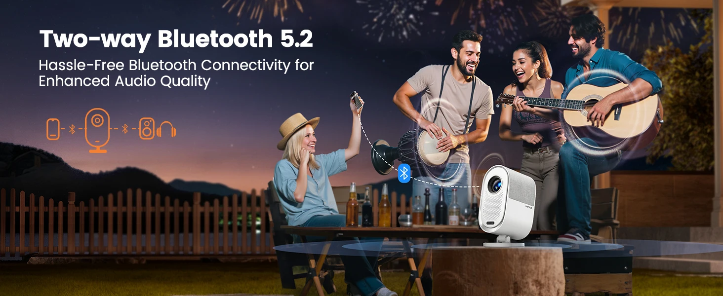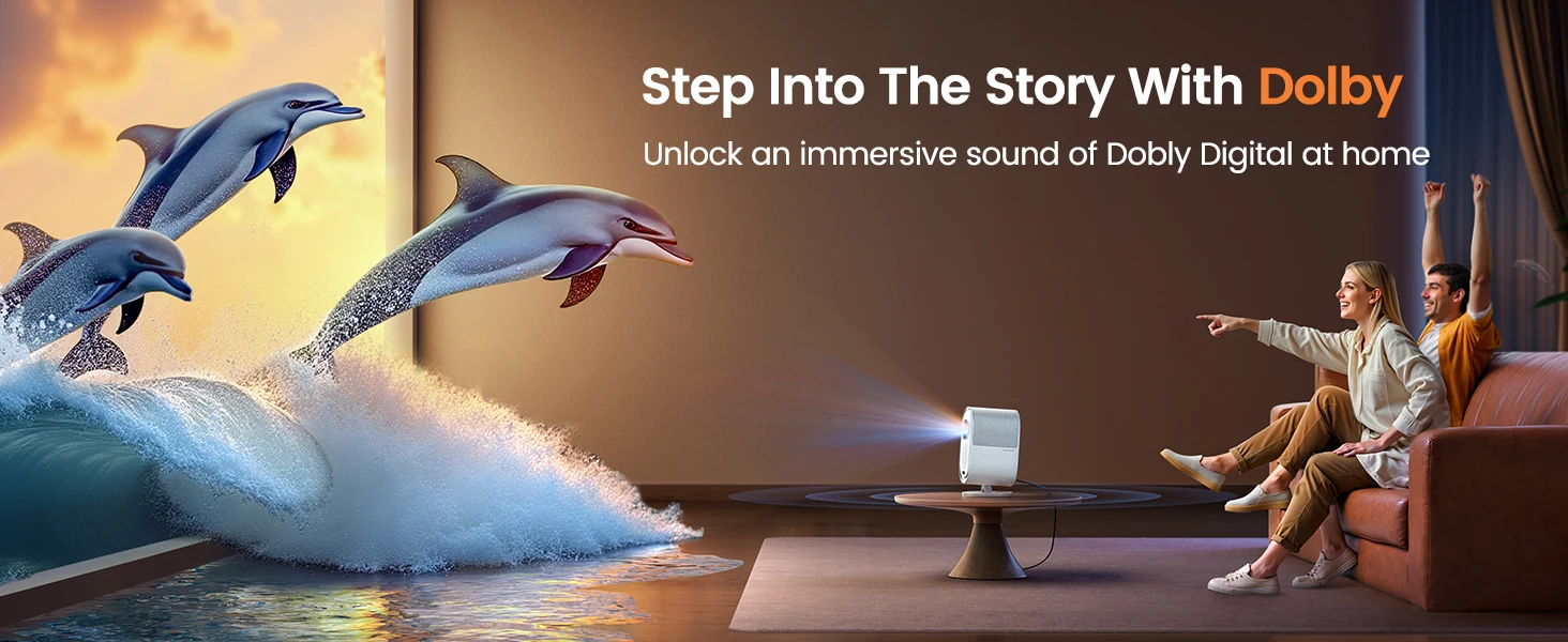 【Cinematic Dolby Sound & Two-way Bluetooth】With a major leap in audio quality compared to earlier models, The movie projector supports Dolby Digital and include dual 10W speakers, providing crystal-clear, dynamic surround sound. HDMI ARC compatibility enables direct connection to your home sound system, while two-way Bluetooth and standalone Bluetooth speaker modes allow wireless pairing with mobile devices or external speakers. Whether for a home theater setup or an outdoor movie night, the Projector delivers an immersive experience.