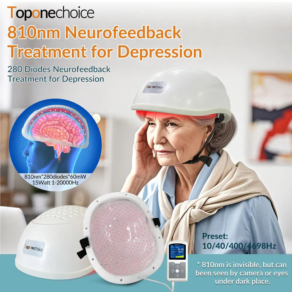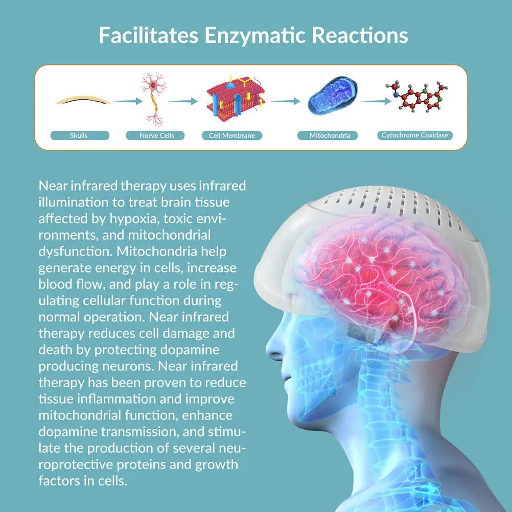 It applies infrared led lights extend through skull, penetrate deep into brain tissue, increase ATP production and blood oxygen to the brain tissue,boost the brain activities, improve memory and enhance cognition.