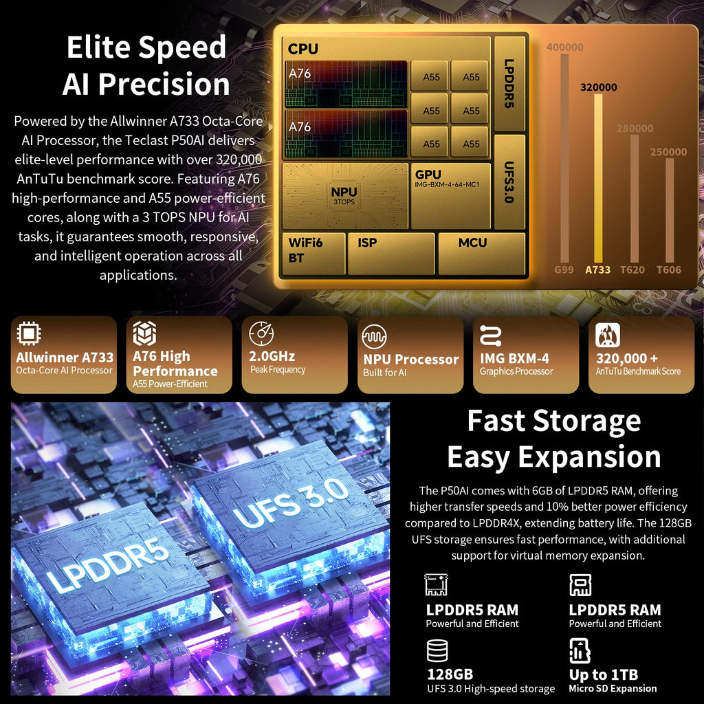 Cpu:Allwinner a733 ai octa-core, 320000+ antutu benchmark