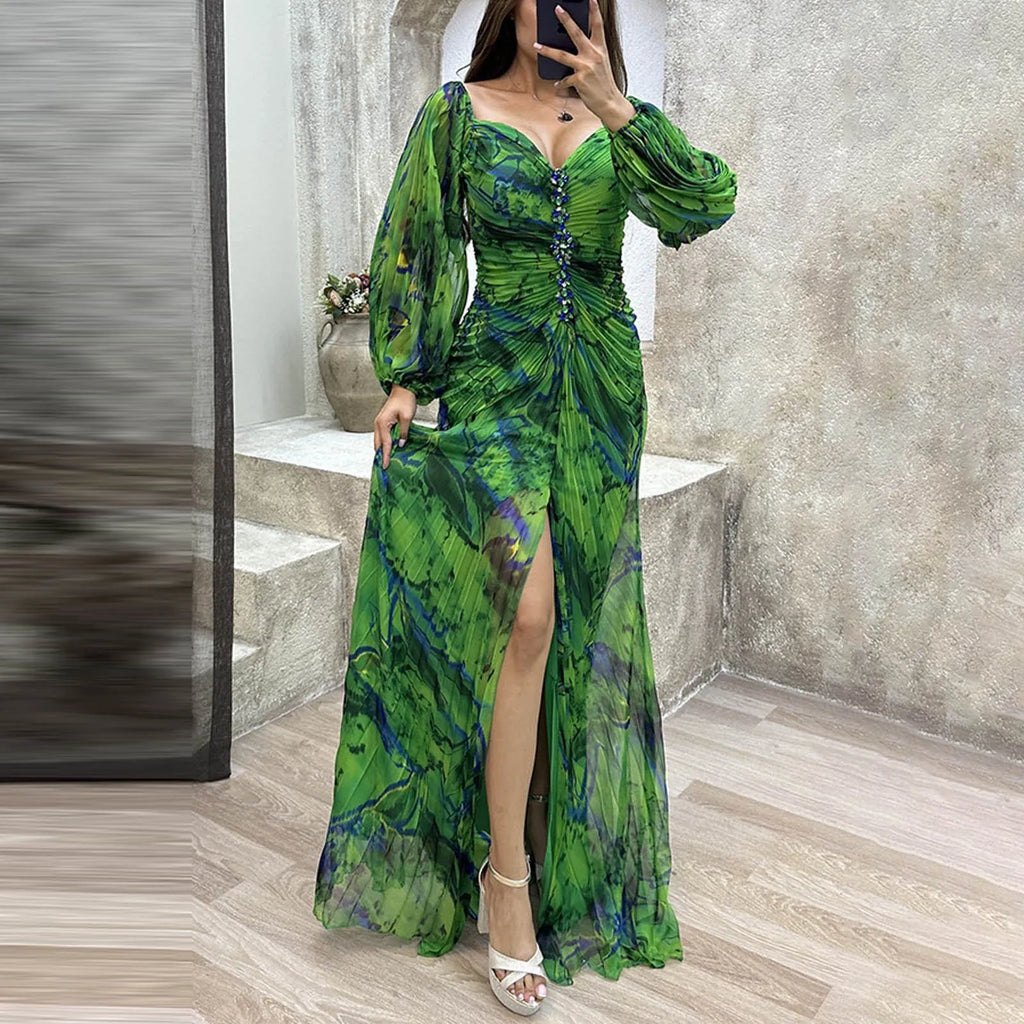 Printing Ladies Long Dress Gathering Pleated Long Sleeved Maix Dresses For Womens Wedding Guest High Slit Cocktail Party Dress