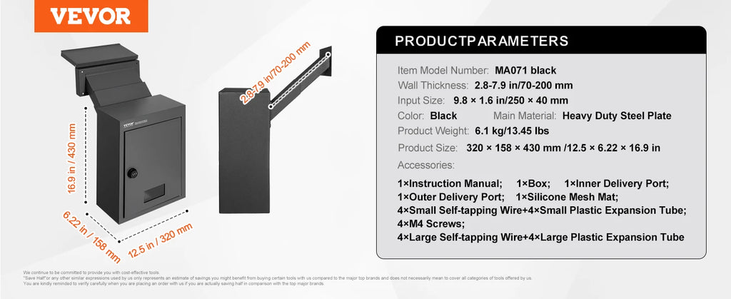 Colour: dark grey, Product size: 320 x 158 x 430 mm / 12.6 x 6.22 x 16.9 inches, Input size: 9.8 × 1.6 inches / 250 × 40 mm, Wall thickness: 2.8 to 7.9 inches/70 to 200 mm, Item model number: MA071 Dark Grey, Main material: sturdy steel plate, Product weight: 6.1 kg / 13.45 lbs