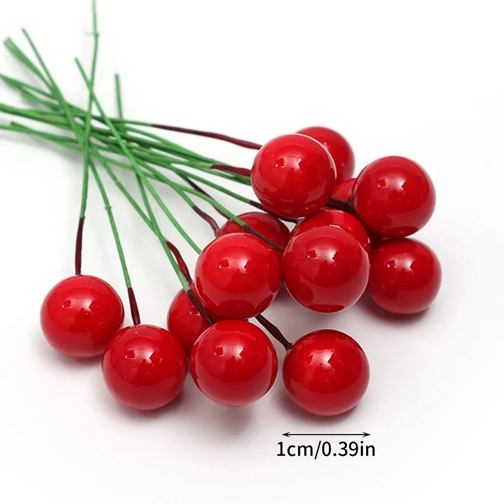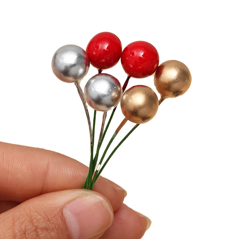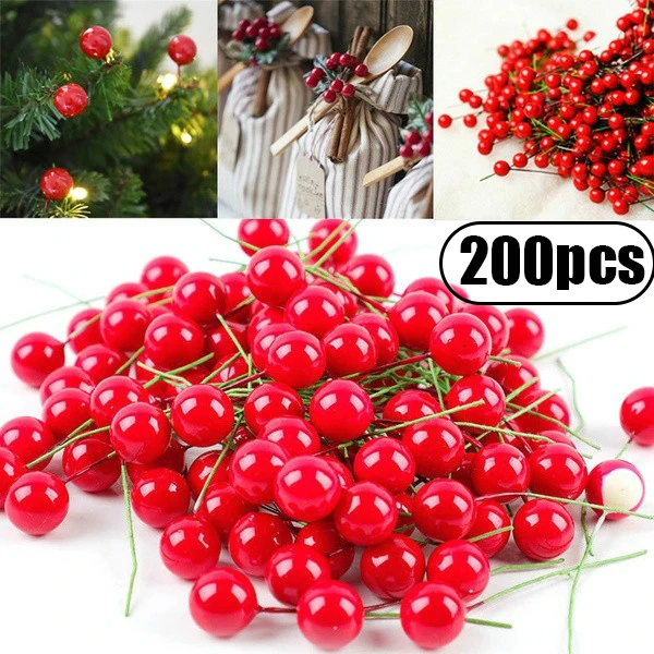 200/50pcs Christmas Artificial Berry Red Gold Cherry Stamen Mini Fake Berries Flowers Pearl Beads for DIY Christmas Party Decor