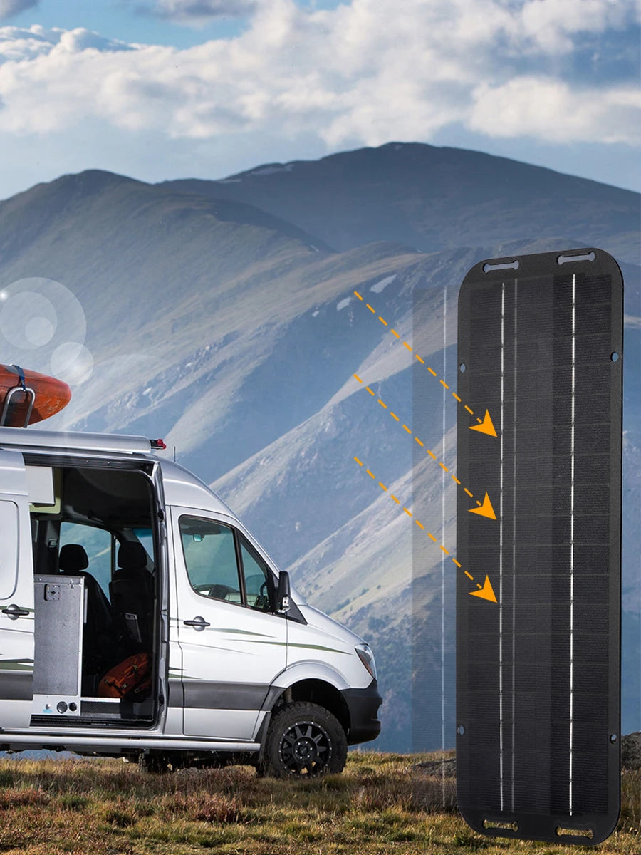 [Multiple Protection and Reliable] The solar trickle charger comes with overcharge and reverse discharge protection module, safe to use. Solar panel charger size: 35x12.5cm, easy to carry.