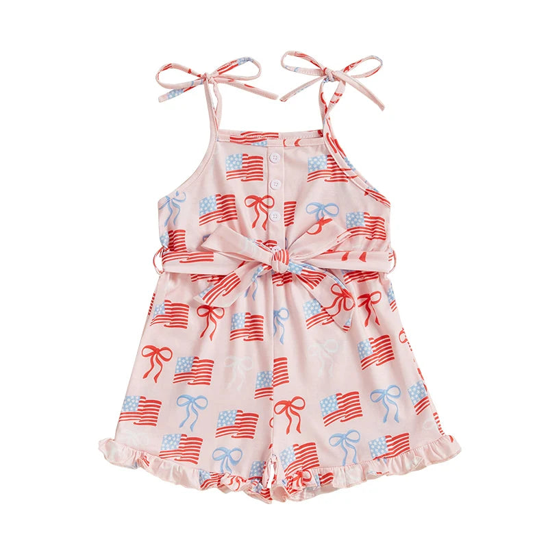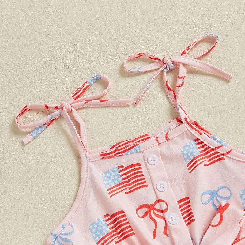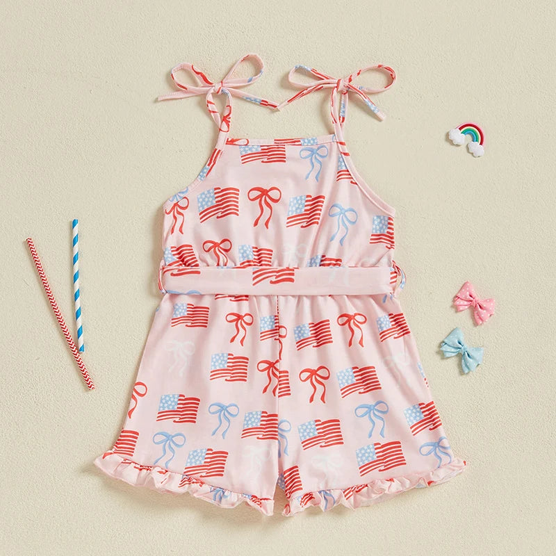 Baby Toddler Girl 4th of July Outfit Loose Fit American Flag Bow Print Sleeveless Spaghetti Straps Jumpsuit with Belt 2 Pcs Set for SummerSize (cm)