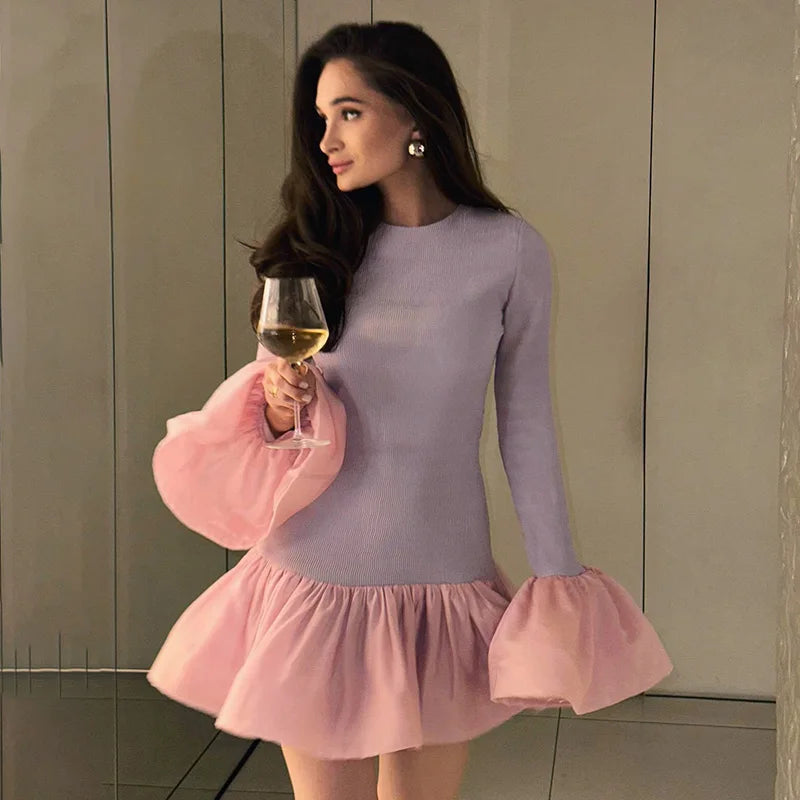 TARUXY Knitted Mini Dress Female Long Sleeves Gown Flare Sleeves Spliced Autumn Winter Dress A-Line Sweet Bodycon Women Clothes