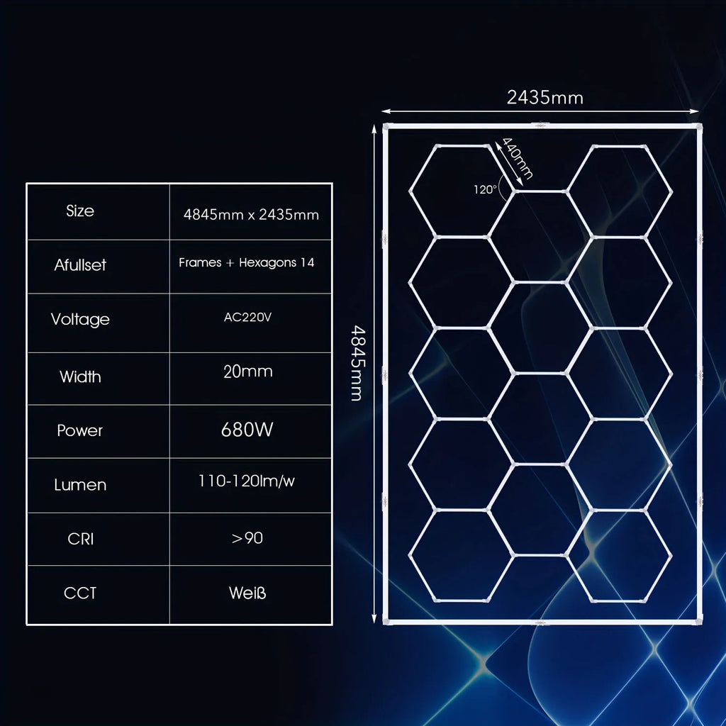 Honeycomb Structure: The hexagonal 680W LED garage light consists of 84 light tubes (14 hexagonal lights). The design inspiration comes from the stable and simple honeycomb structure.