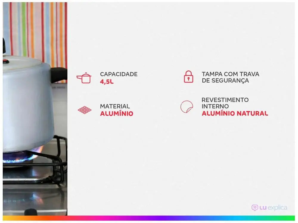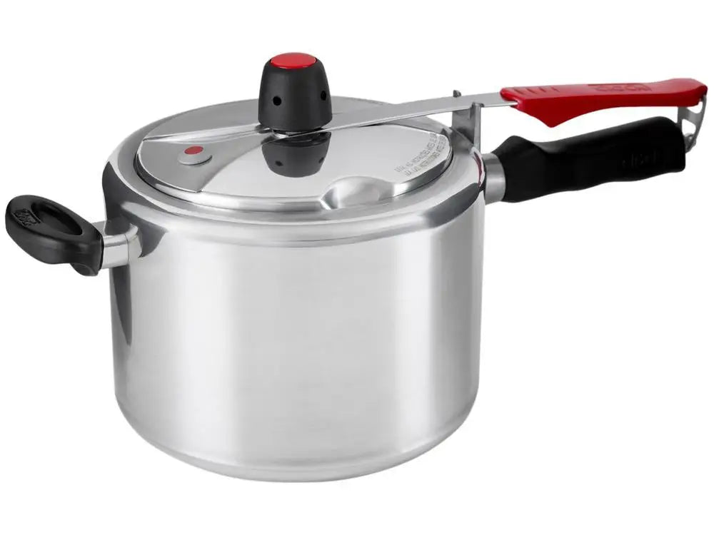 A panela de pressão Original Polida Clock na cor prata com fechamento interno 4,5 litros é indispensável para o preparo de diversos pratos! Para facilitar a sua vida e levar mais segurança à sua cozinha, a Clock, tradicional e mais segura marca de panela de pressão traz diversos benefícios, como o exclusivo indicador de pressão: ao pegar pressão, o indicador (pino) sobe, avisando que a panela não pode ser aberta. Depois de ser desligado o fogo e liberada toda a pressão interna, o pino abaixa, indicando que a tampa pode ser retirada com total segurança. Possui também um recorte especial que impossibilita o encaixe errado da tampa no corpo da panela. Esse sistema permite a centralização correta da tampa, feita de forma fácil e intuitiva e garantindo melhor vedação. Conta com três sistemas de segurança: válvula controladora (peso) - saída de vapor usual para liberar a pressão interna durante o funcionamento normal da panela; válvula repetitiva (pino) e sistema SafePlus (borracha), caso a panela esteja entupida o anel de vedação se desloca pelas cavidades laterais da tampa, liberando a pressão interna. Ela traz cabo reforçado e asa ergonômica, para garantir facilidade e máxima segurança no manuseio. Clock, a mais segura!