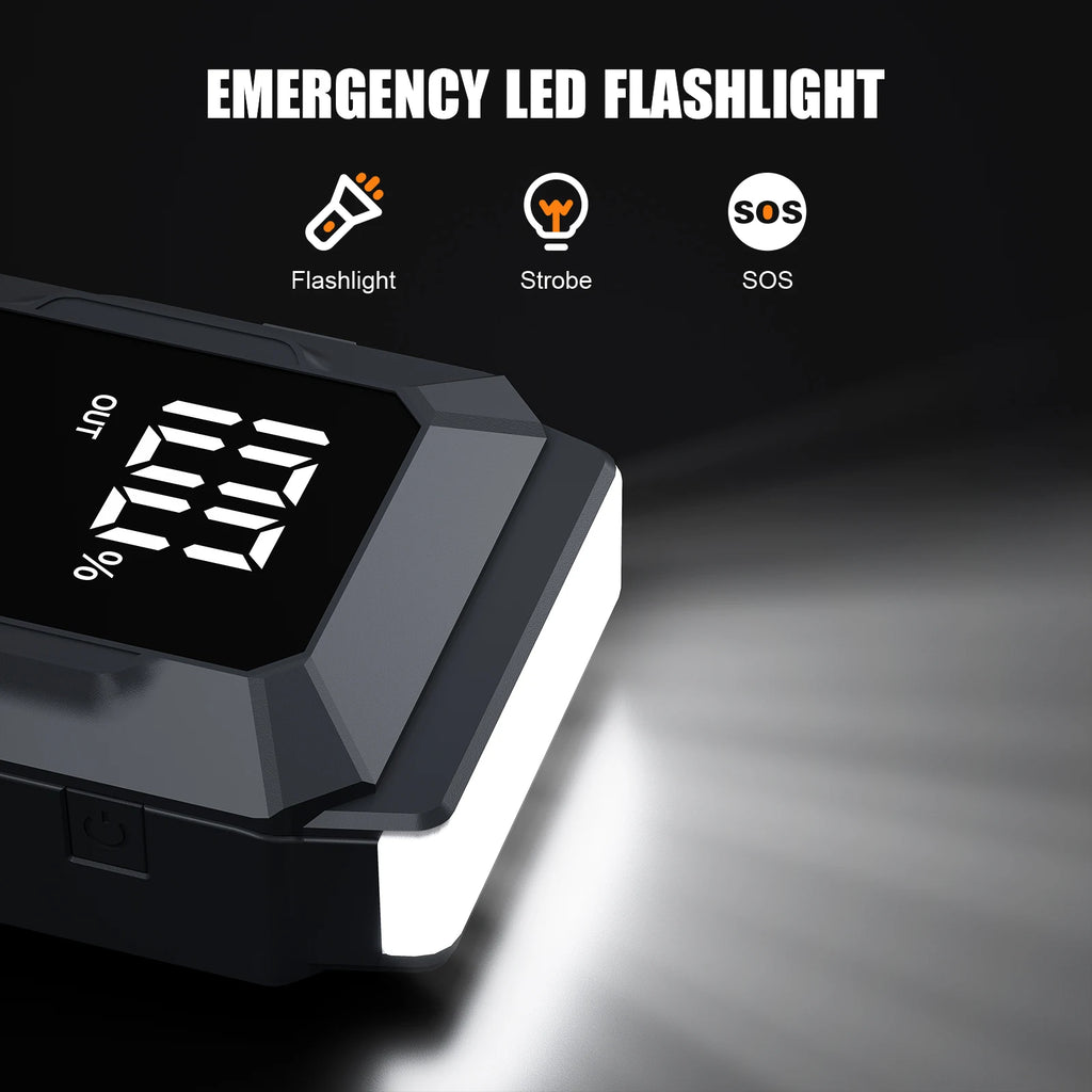 The starting power bank has a 3000A peak current and a large battery capacity of 23800mAh. It can start 12V vehicles (up to 10.0L gasoline or 8.0L diesel engines) in a few seconds, and can be used up to 60 times after fully charged, suitable for cars, trucks, vans, SUVs, motorcycles, pickups, etc.
