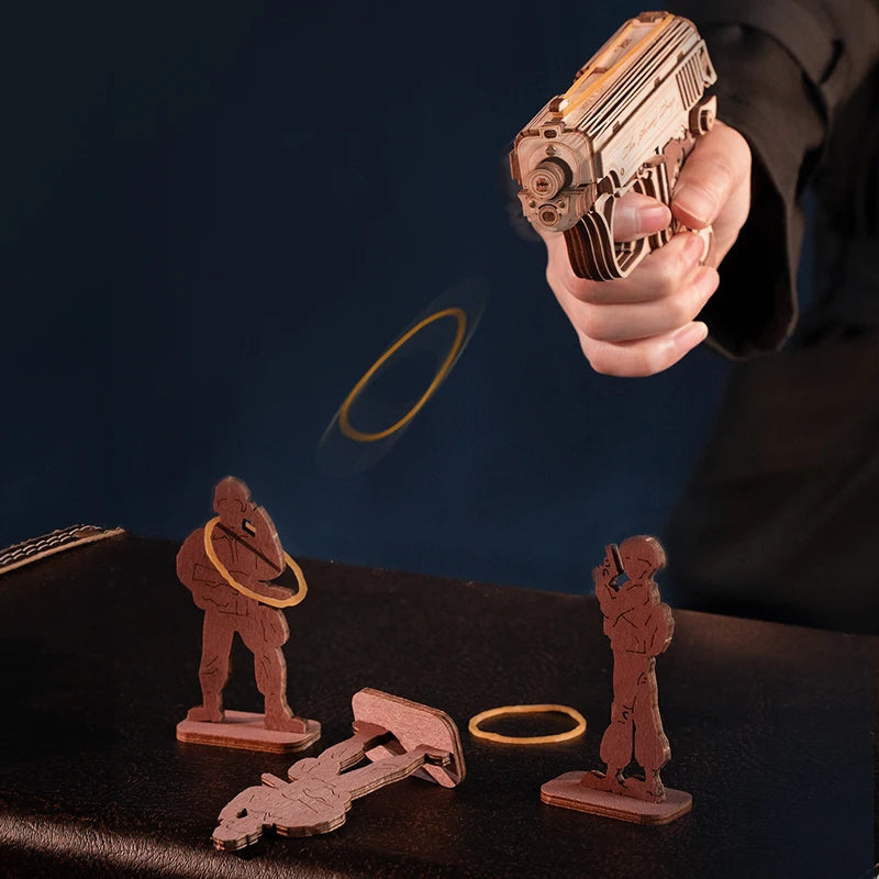 This rubber band gun transcends mere plaything status—it's a work of art. The grip, designed with a bullet passing through a rose, infuses a romantic flair, enhanced by a striking brown-red and natural wood finish.