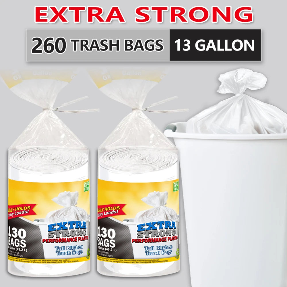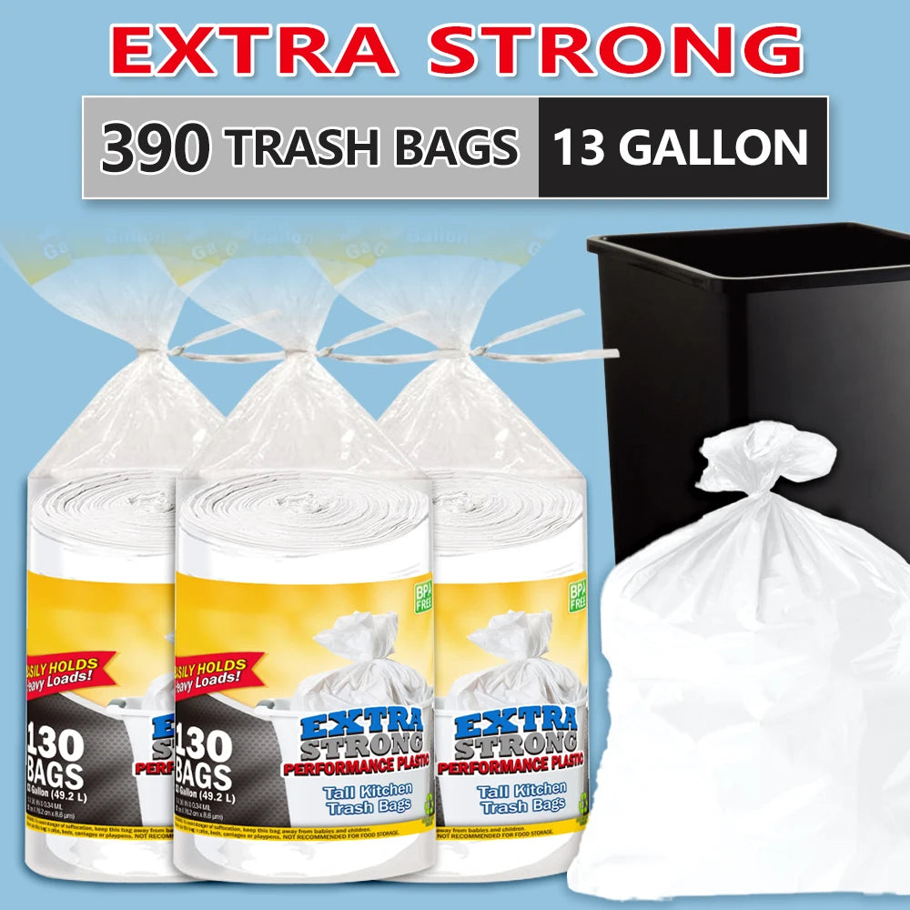 13 GALLON GARBAGE BAGS: The package contains 390 Xtratuff Tall Kitchen Drawstring Trash Bag, white, unscented, 13 gallon trash bags, which will meet your daily needs.