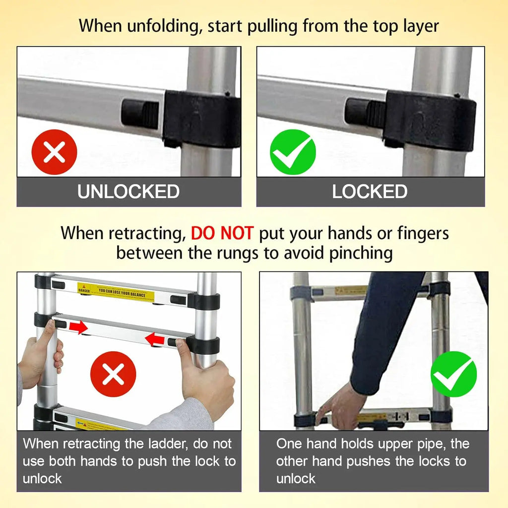 2. DO NOT put your hands or fingers between the rungs when retracting to avoid pinching.