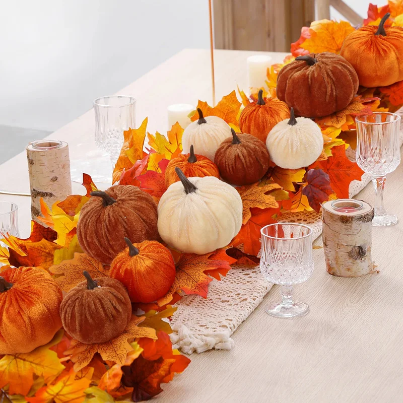 9Pcs Velvet Artificial Pumpkin Ornaments Halloween Party Thanksgiving Dinner Table Decoration Autumn Fall Home DIY Craft Wreath