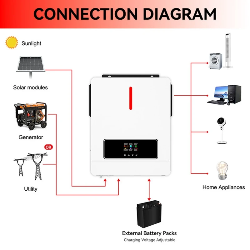 it is an off-grid hybrid inverter that works without batteries. This inverter is a high frequency inverter,Lead-acid batteries, gel batteries, and lithium batteries can be used.