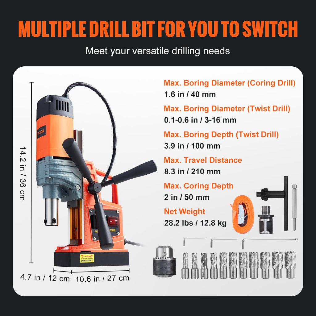 Elevate your drilling efficiency with our advanced magnetic drill press. Featuring a robust 1400W motor, this drill press delivers impressive power for creating precise holes across a range of diameters, all while offering 10-speed settings for versatile drilling needs. With its powerful 13000N holding force, it securely attaches to steel and iron surfaces, ensuring stability and accuracy during operation. Crafted from durable titanium magnesium alloy, this drill is perfect for both home projects and industrial tasks.