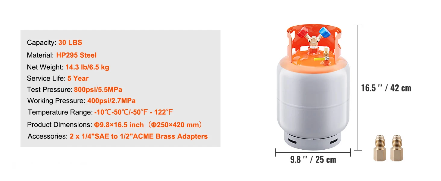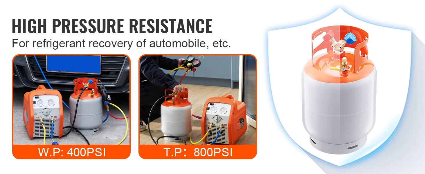 The 30 lb refrigerant recovery tank with a trace amount of nitrogen is often used to recover refrigerant for household cars, refrigerators, air conditioners, etc.