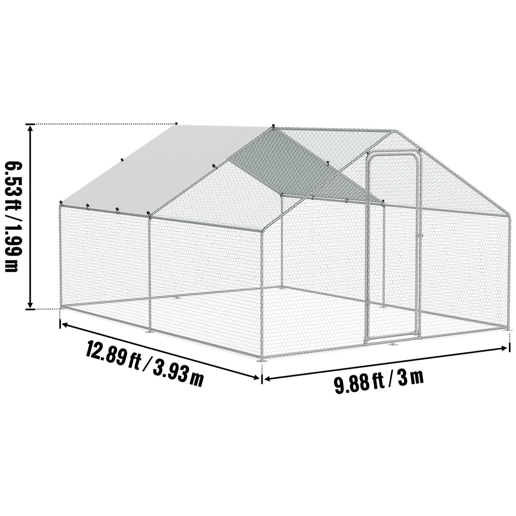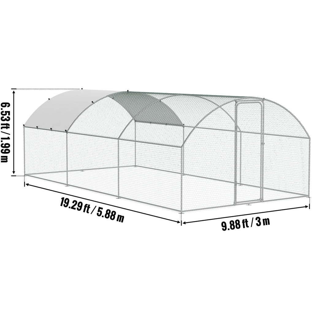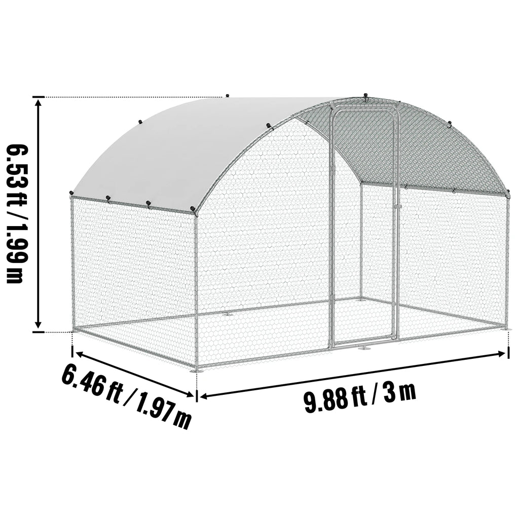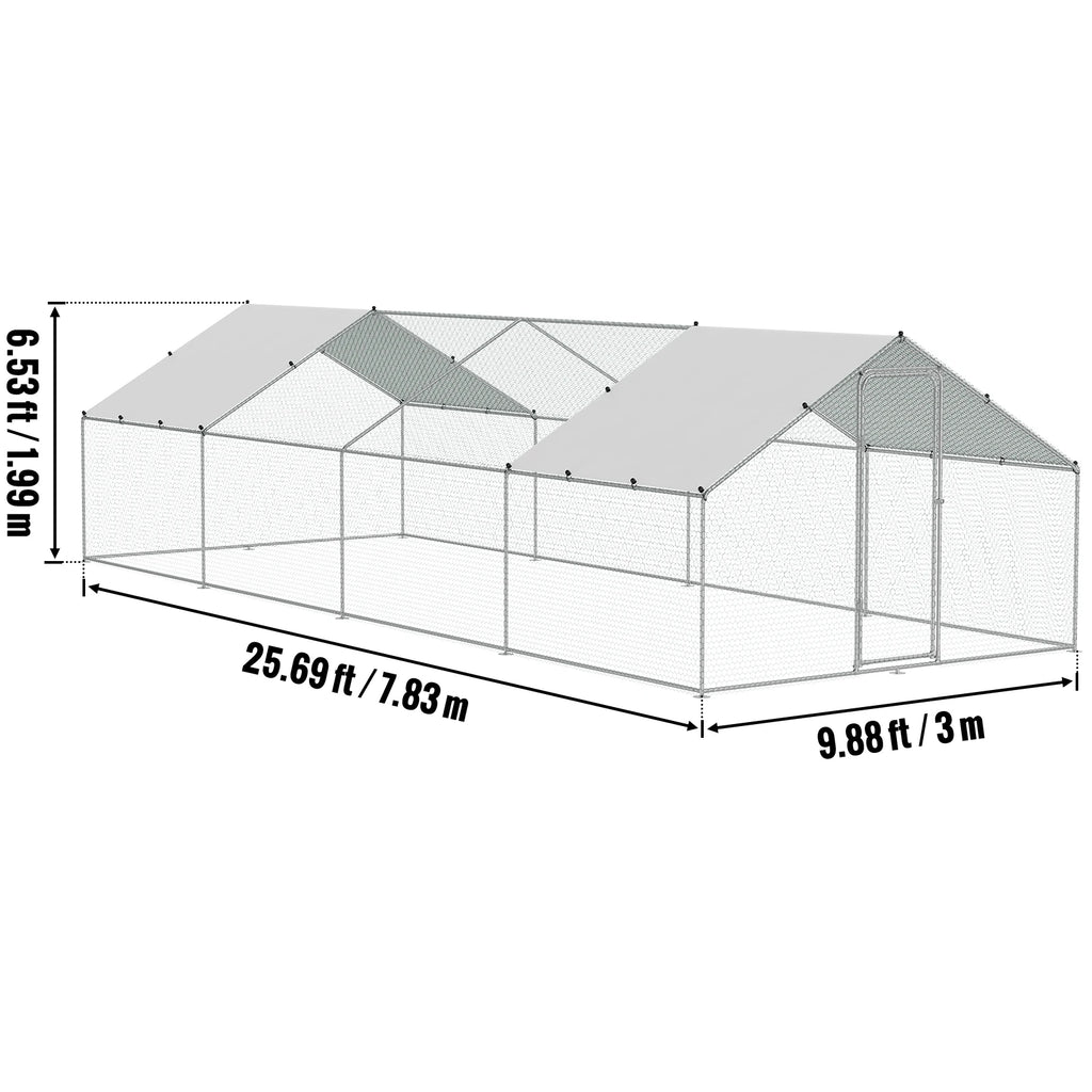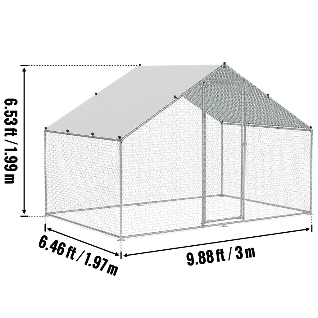• Spacious Living Area: Offering a generous 3x7.83x1.99 m/9.88x25.69x6.53 ft of space, this metal chicken run features four-sided ventilation, creating a healthy and comfortable environment. The PE-coated canopy provides sun protection, waterproofing, and tear resistance, shielding your poultry from external elements.