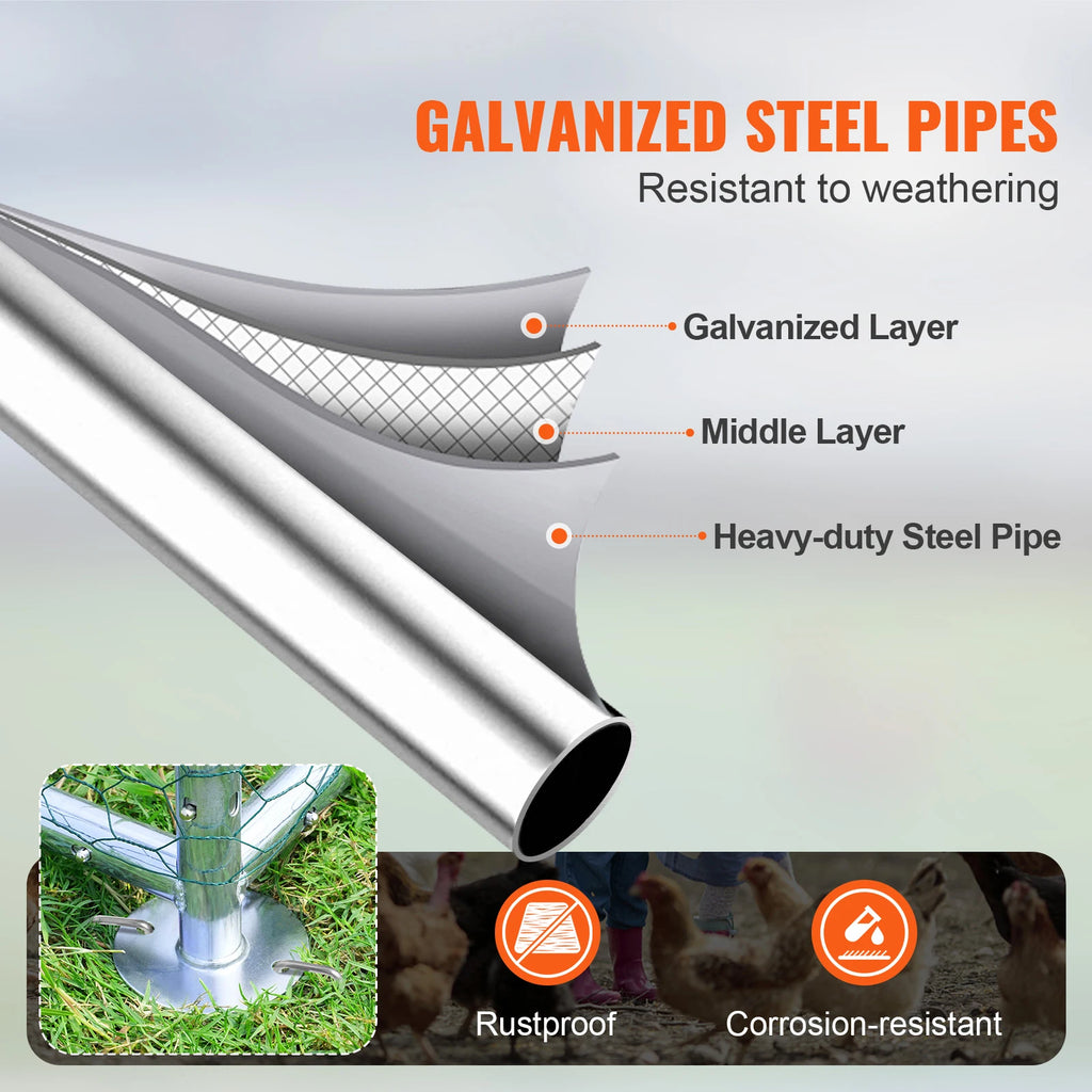 With 1" thick steel pipes and hexagonal protective mesh, this walk in chicken run offers robust support and protection, ensuring the poultry can roam freely in a secure environment.