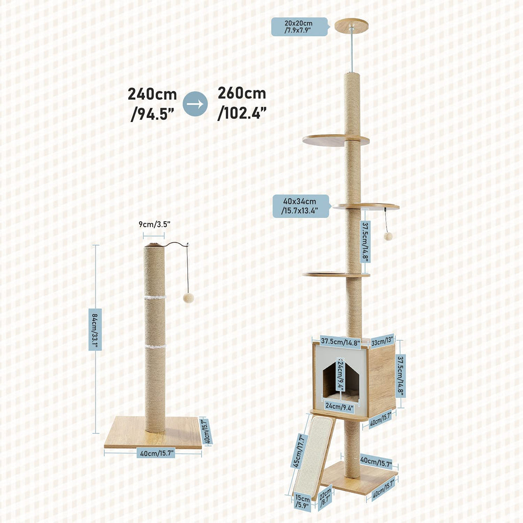Four Tier Floor-to-Ceiling Cat Tree + Scratching Post Toy- 94.5-102.4 in Modern Cat Climbing Tower with a Scratcher Beige