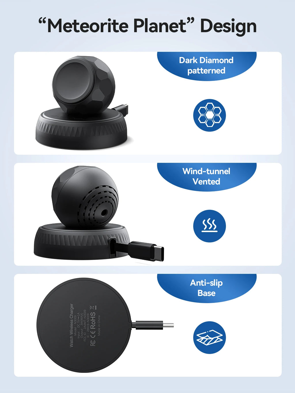 • Powerful Magnetic and Anti-Slip Base: Equipped with magnetic modules that are 10 times stronger than others, this charging station aligns effortlessly with Apple Watch for secure and efficient charging. The upgraded anti-slip base (weighing 95g) also provides stability during use.