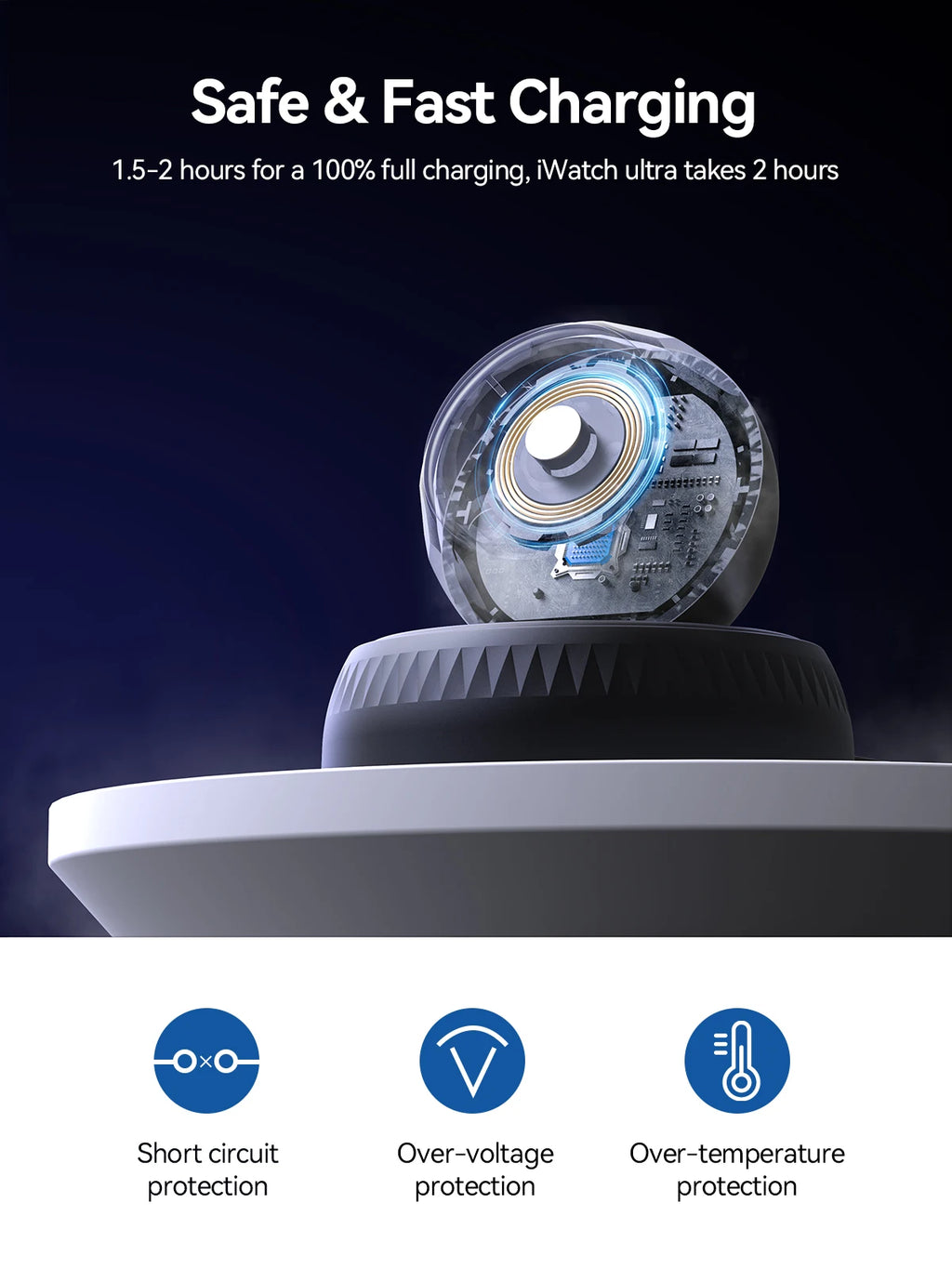 • One-Step Fast Charging: With our all-in-one smartwatch charger and a power source, intelligent chip technology fully charged in about 2 hours for iWatch Series 10/9/8/6 (2.5 hours for Series 7 and 3.5 hours for Apple watch Ultra). Enjoy charging safety protections against overcharging, overheating, and short circuits.