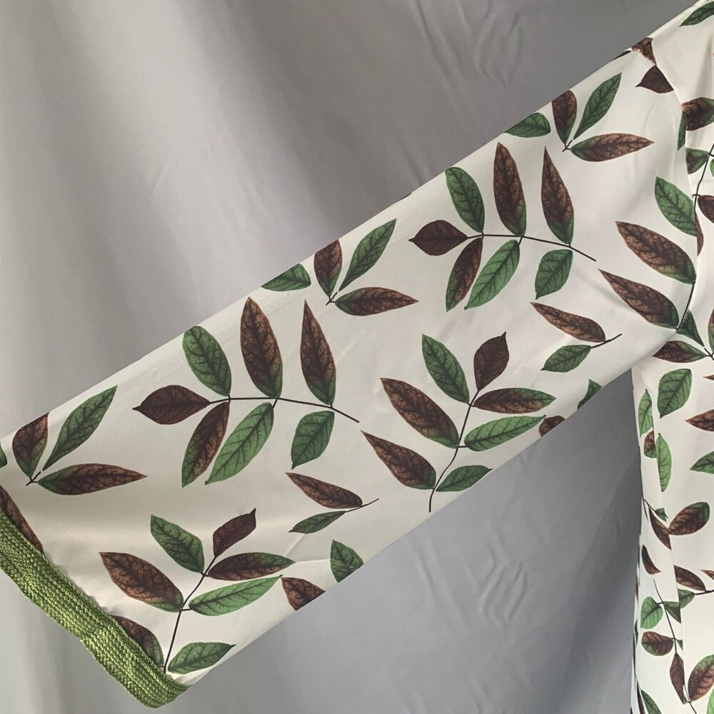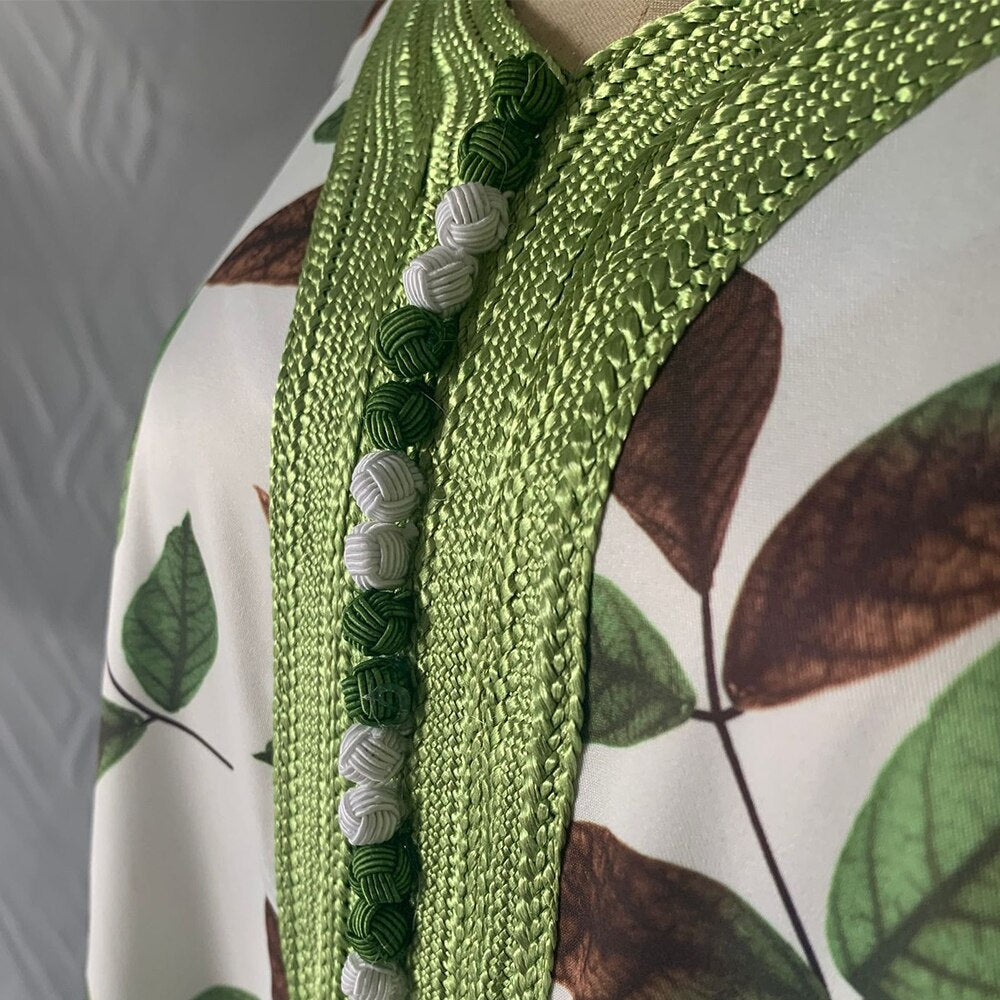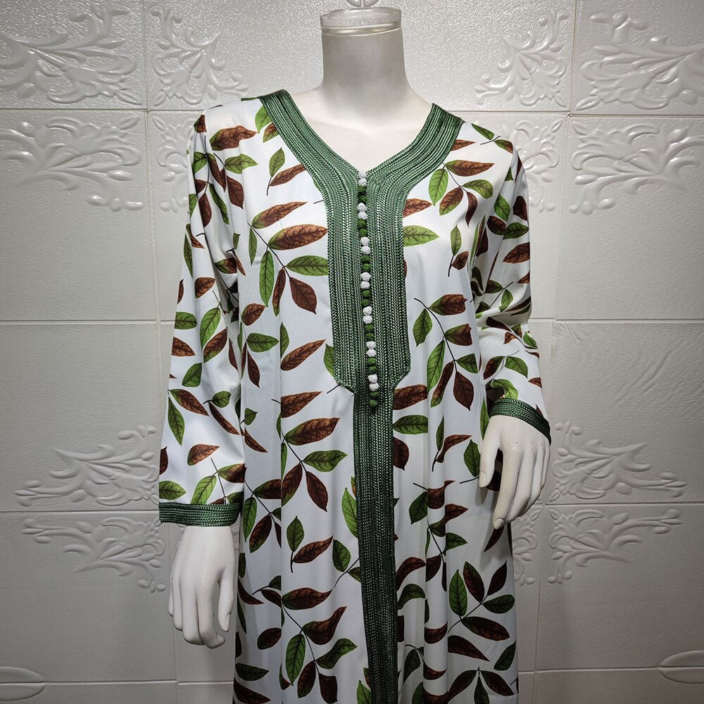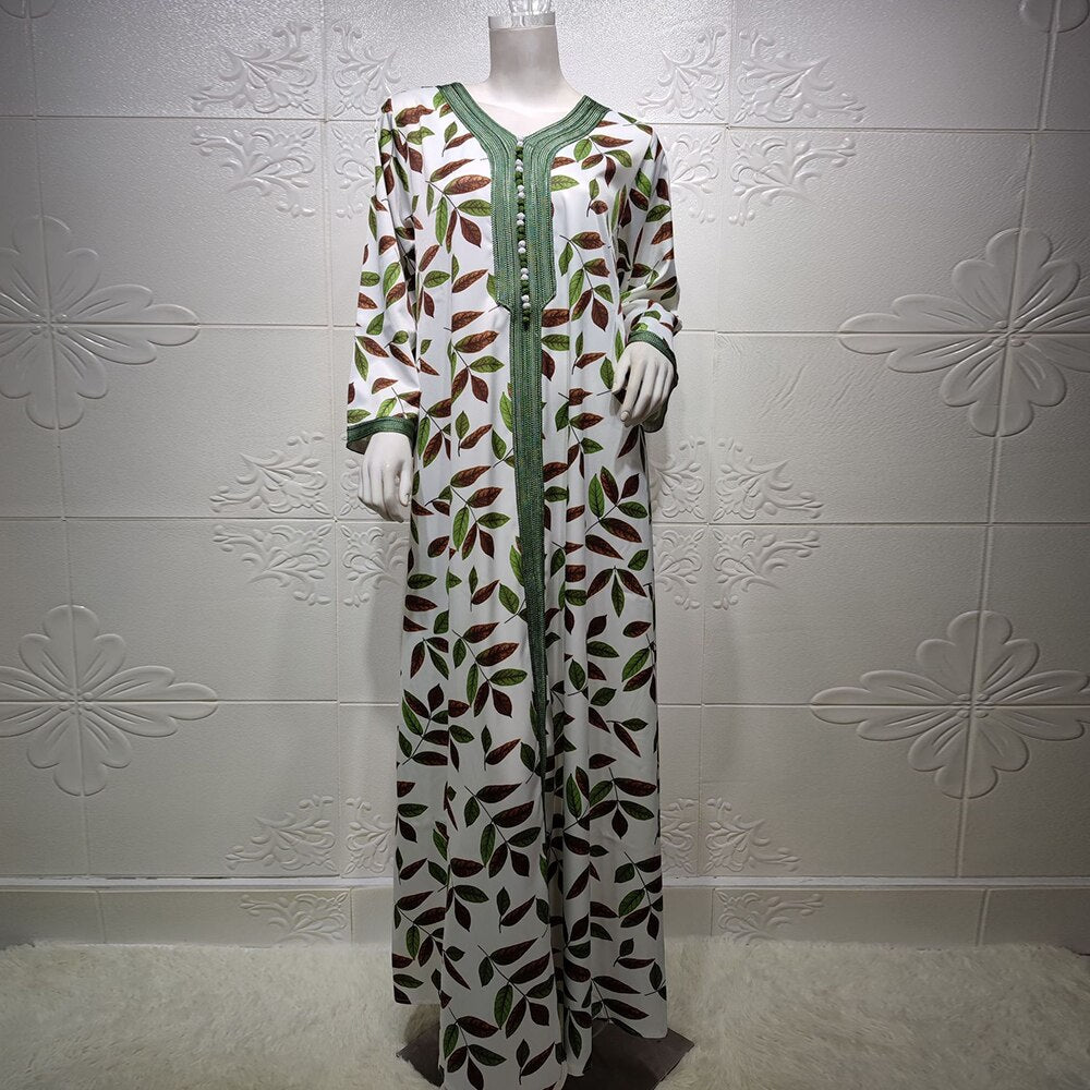 Siskakia Mittlerer Osten Frauen Langes Kleid Band V-Ausschnitt Volle Ärmel Blätter Drucken Maxikleider Türkei Arabisch Dubai Muslimische Kleidung