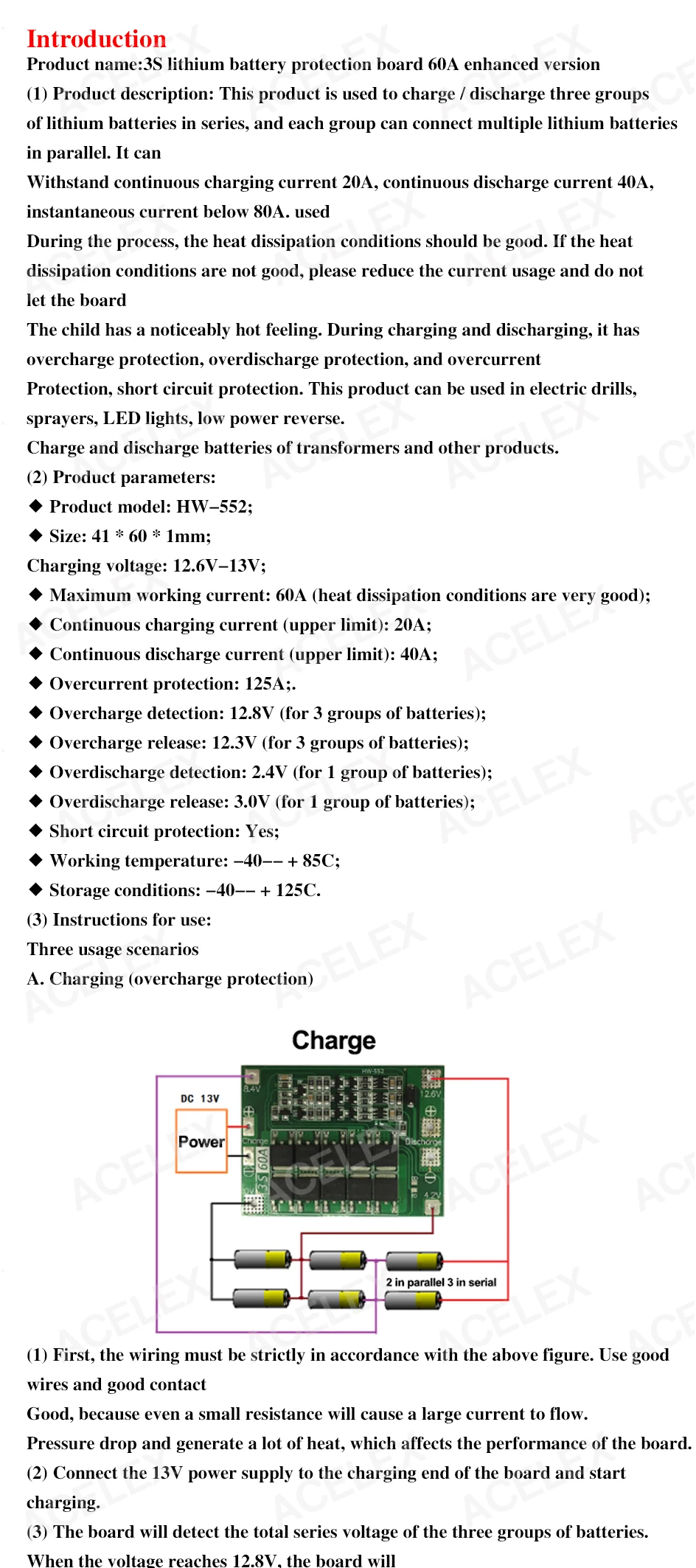 (1) Product description: This product is used to charge / discharge three groups of lithium batteries in series, and each group can connect multiple lithium batteries in parallel. It can Withstand continuous charging current 20A, continuous discharge current 40A, instantaneous current below 80A. used During the process, the heat dissipation conditions should be good. If the heat dissipation conditions are not good, please reduce the current usage and do not let the board The child has a noticeably hot feeling. During charging and discharging, it has overcharge protection, overdischarge protection, and overcurrent Protection, short circuit protection. This product can be used in electric drills, sprayers, LED lights, low power reverse. Charge and discharge batteries of transformers and other products.