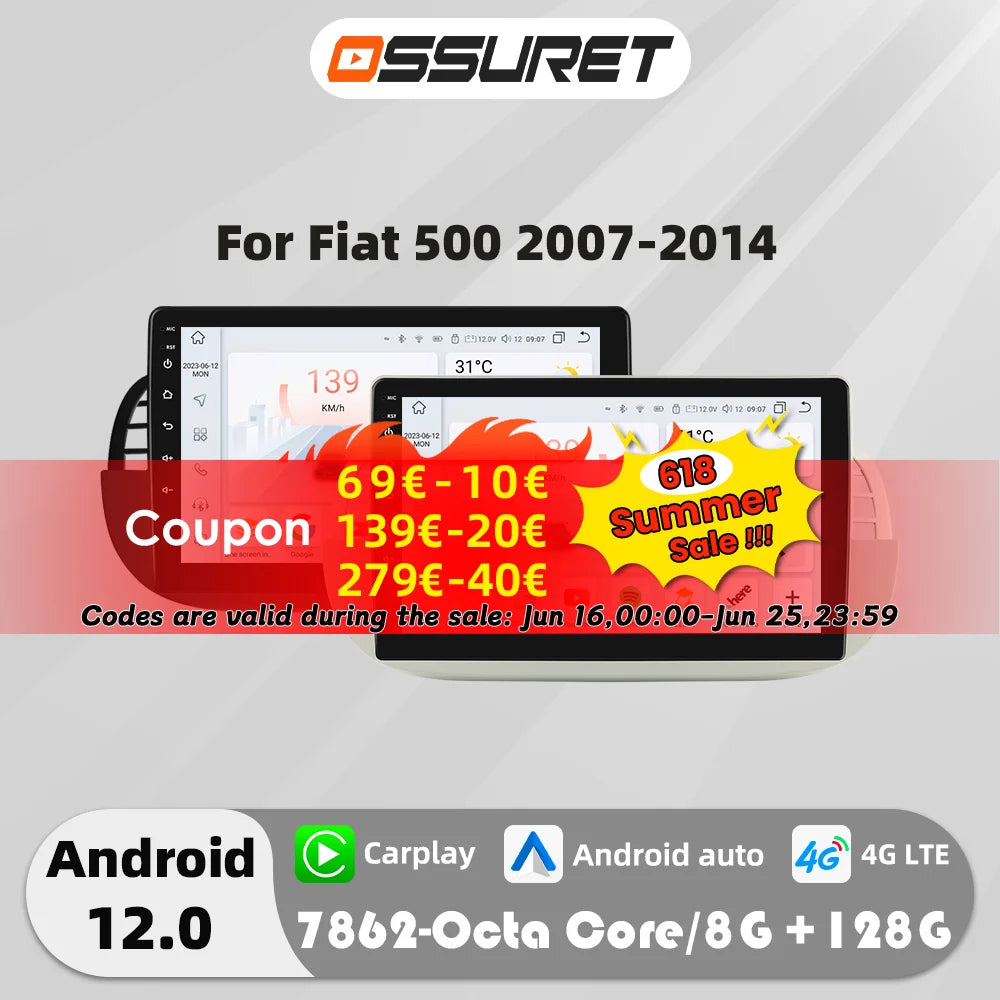 4G 8Core Android Car radio GPS Stereo For Fiat 500 2007-2014 Multimedia Video player 2DIN Autoradio DSP Carplay 7862 Head Unit