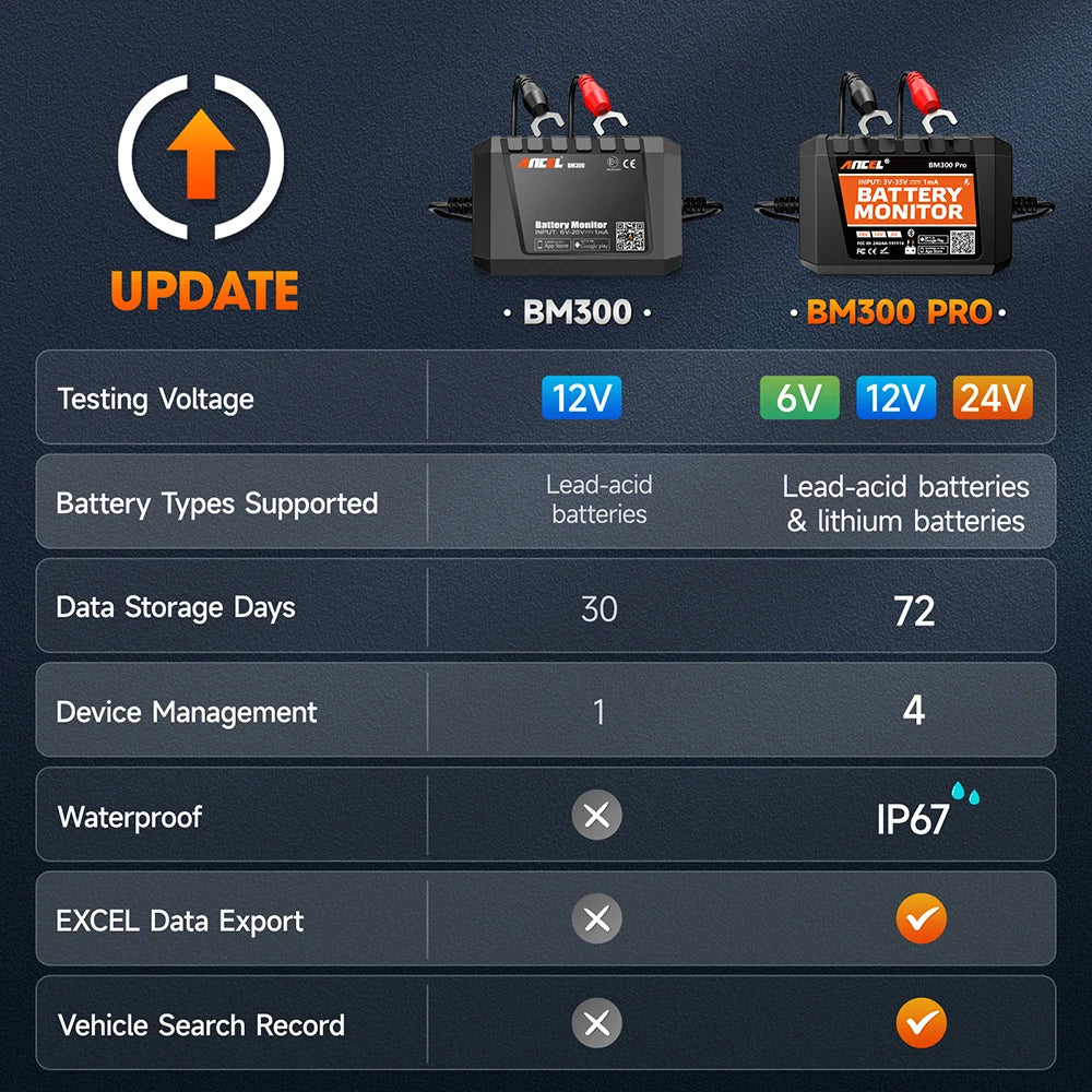 ANCEL BM300 PRO 6V 12V 24V Bluetooth Battery Monitor Battery Health Analyzer Charging Cranking System Test/Alarm Battery Tester