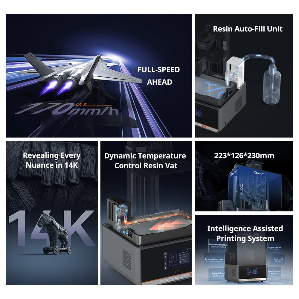 3.Do i need to buy high speed resin for the fast prints? Or this can print fast with the normal resin?Photon Mono M7 Pro can support both High Speed Resin and Standard Resins. The print speed is different. Max Speed 130mm/hr, 0.1mm Layer With Standand Resin; Max Speed170mm/hr, 0.1mm Layer With High Speed Resin.