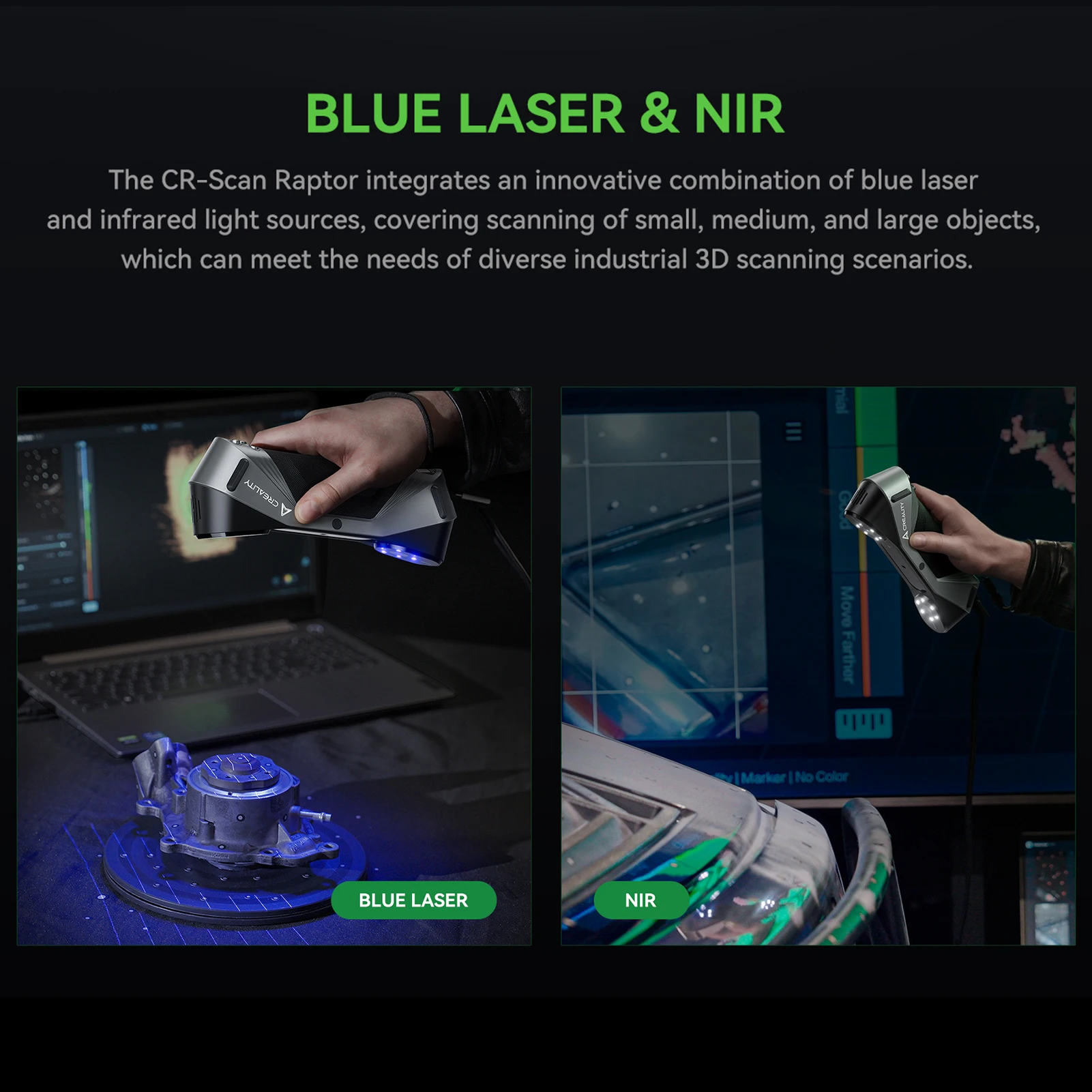 【High-Speed Scanning】 Blue light scanning speed up to 60fps, NIR scanning speed up to 20fps. Combining line with infrared structured light, the scans object ranging in size from 5*5*5 mm,-2000*2000*2000 mm, effortlessly scanning small figurines, bolts, faces, human bodies, automobile components, and more, versatile scanning for all sizes. The CR-Scan Raptor utilizes speckle matching 3D imaging. No markers needed for feature-rich workpieces. Objects can be scanned quickly and directly.