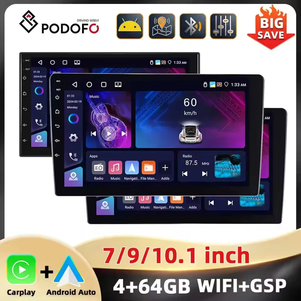 Podofo 4 + 64G 7 ''/9''/10.1 ''Car Radio Universal Android Multimedia Player WIFI GPS Navigation Carplay Android Auto DSP Car Audio
