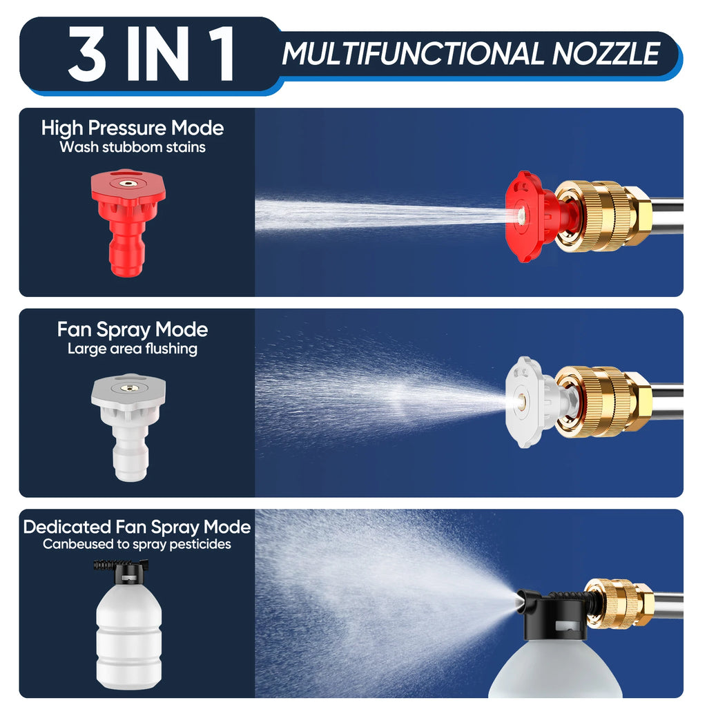 3. Multi-functional nozzle: The high-pressure gun is equipped with multi-functional nozzles, featuring various water types and adjustable pressure, making it suitable for different application scenarios. The cordless design also allows for greater flexibility and freedom of movement.